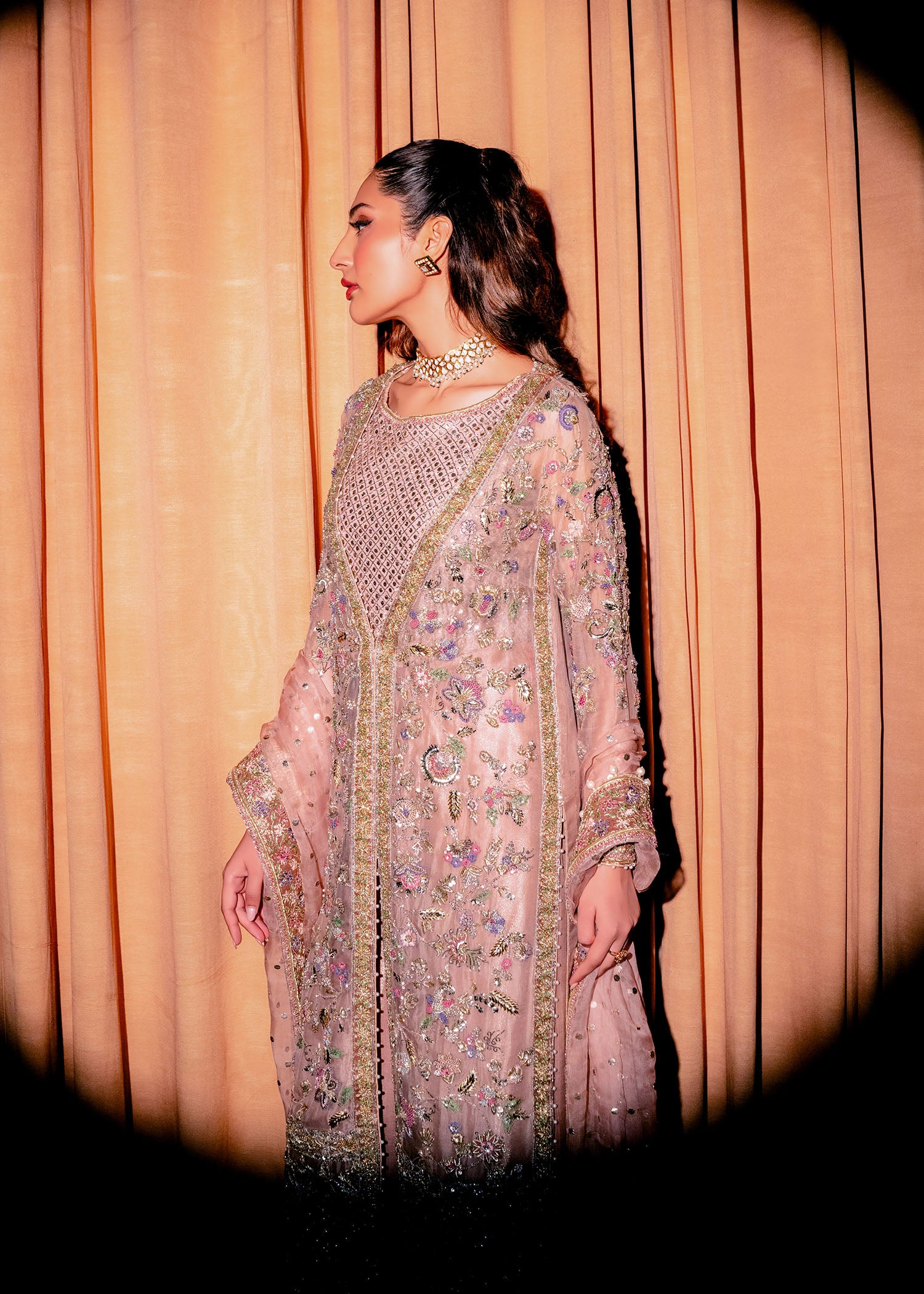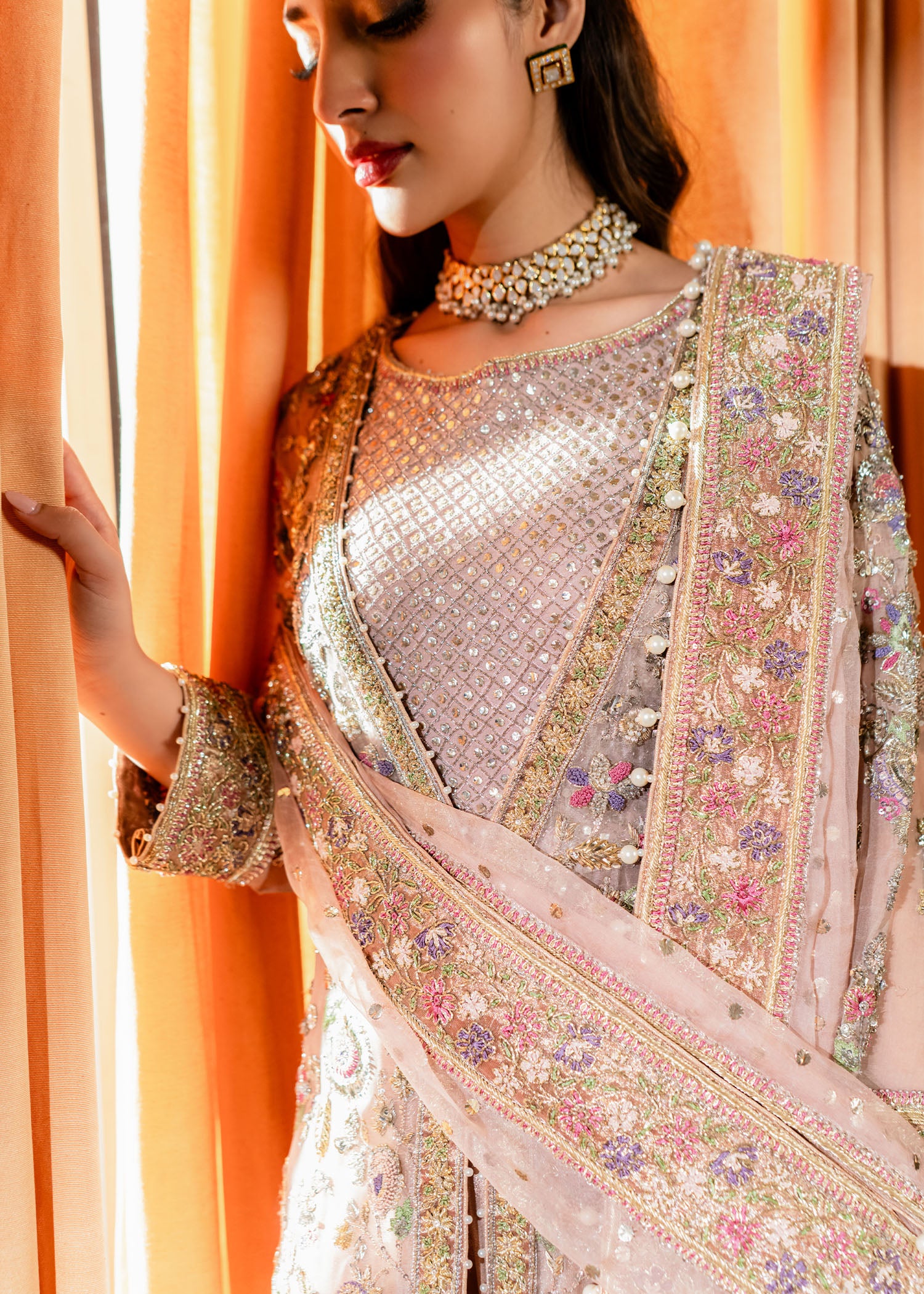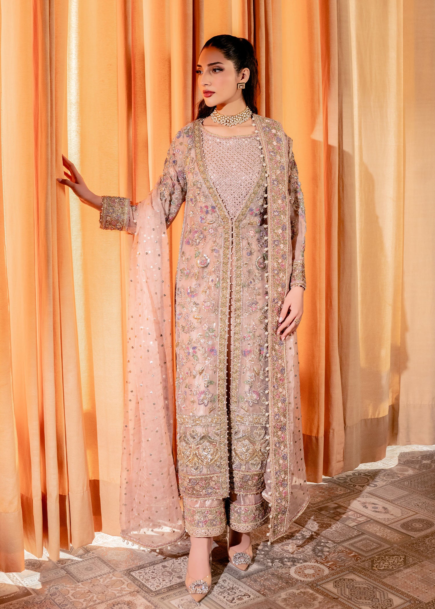 Delicate floral motifs adorn the fabric, expertly embroidered with soft pastel silk threads, creating a soft and enchanting aura. The blend of blush pink, lavender, and mint creates a soothing yet captivating effect. Mukesh embroidery adds a gentle shimmer, bringing an ethereal glow to the jacket .Crafted with meticulous attention to detail, this jacket embodies a perfect balance of timeless design and contemporary elegance, making it an ideal choice for a day time event . Its radiance and subtle charm will effortlessly captivate attention during each moment of the celebration.