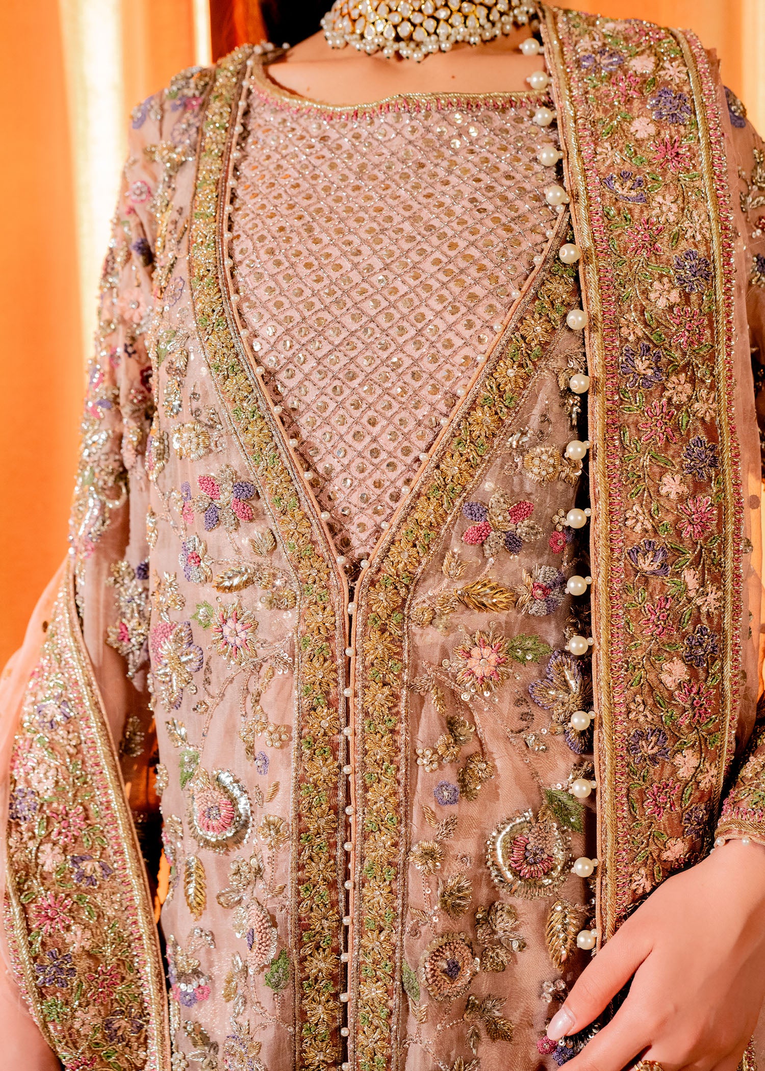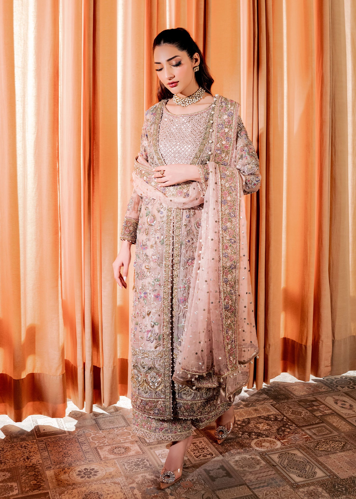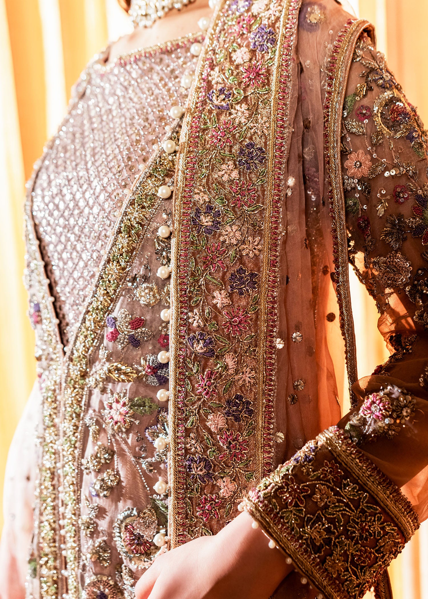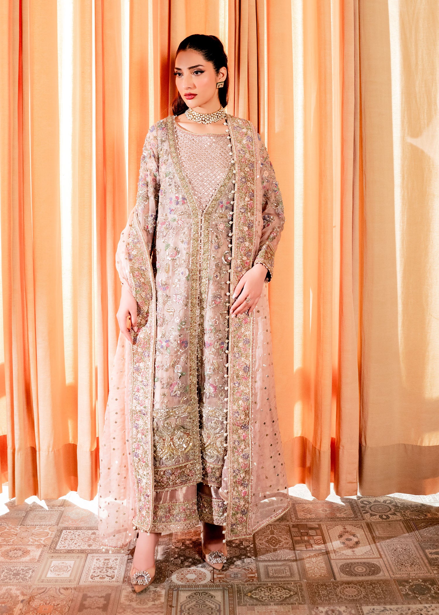 Delicate floral motifs adorn the fabric, expertly embroidered with soft pastel silk threads, creating a soft and enchanting aura. The blend of blush pink, lavender, and mint creates a soothing yet captivating effect. Mukesh embroidery adds a gentle shimmer, bringing an ethereal glow to the jacket .Crafted with meticulous attention to detail, this jacket embodies a perfect balance of timeless design and contemporary elegance, making it an ideal choice for a day time event . Its radiance and subtle charm will effortlessly captivate attention during each moment of the celebration.