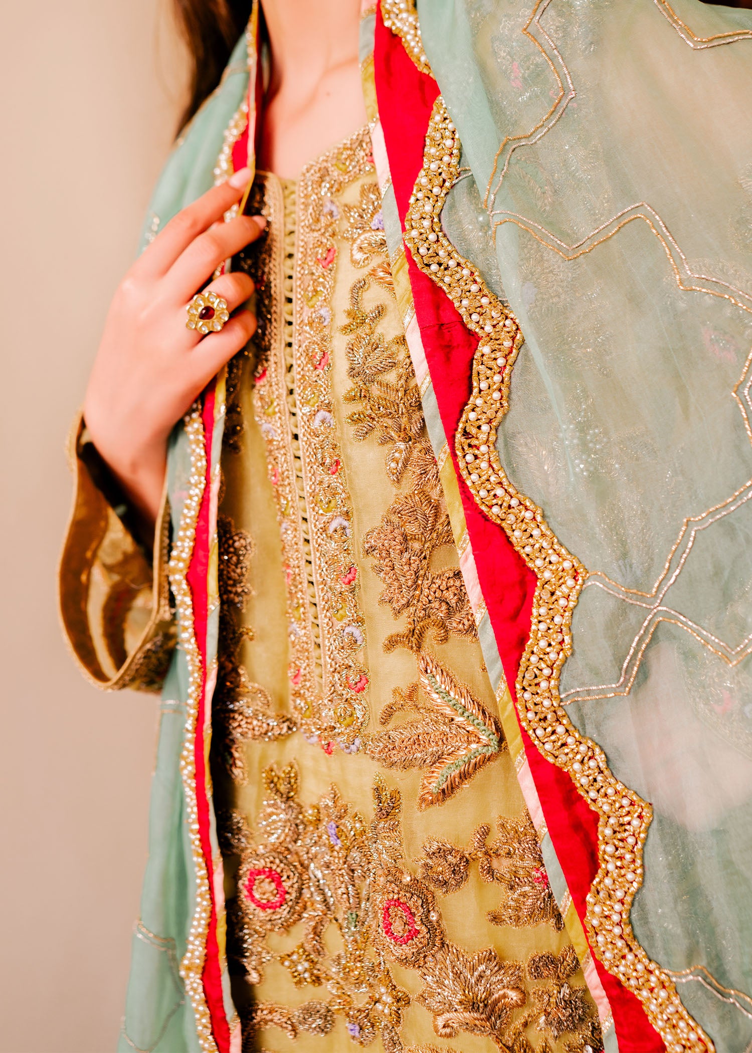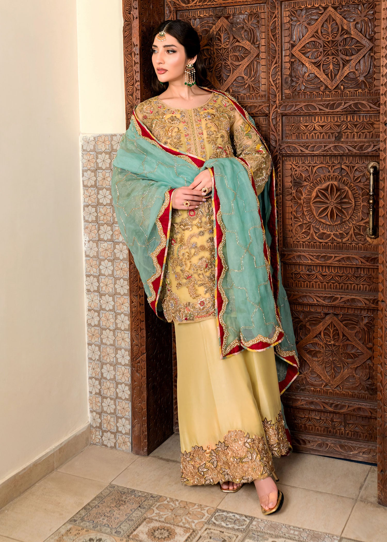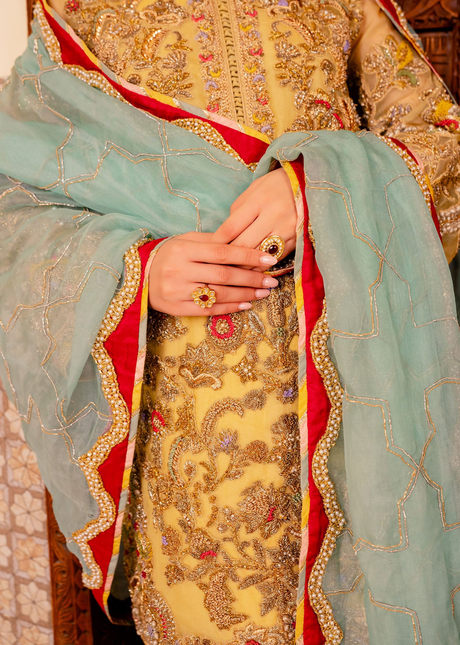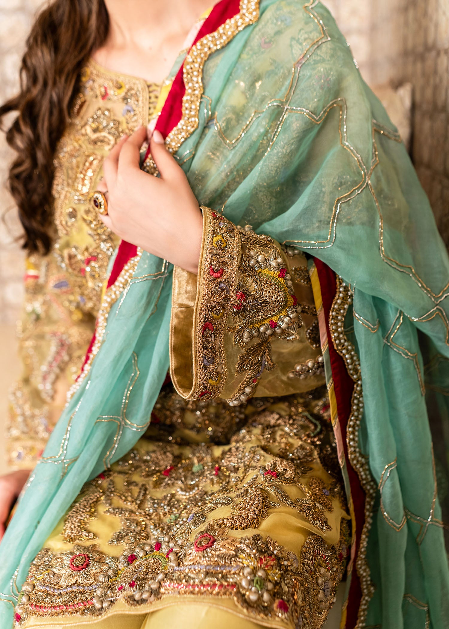 A statement ensemble crafted in a striking yellow base, paired with a contrasting candy mint dupatta accentuated with red hues. This timeless formal is entirely handcrafted using exquisite zardozi and gota work, showcasing artistry in every detail. Perfect for bridesmaids or wedding guests who wish to embrace tradition with a fresh, vibrant touch.
