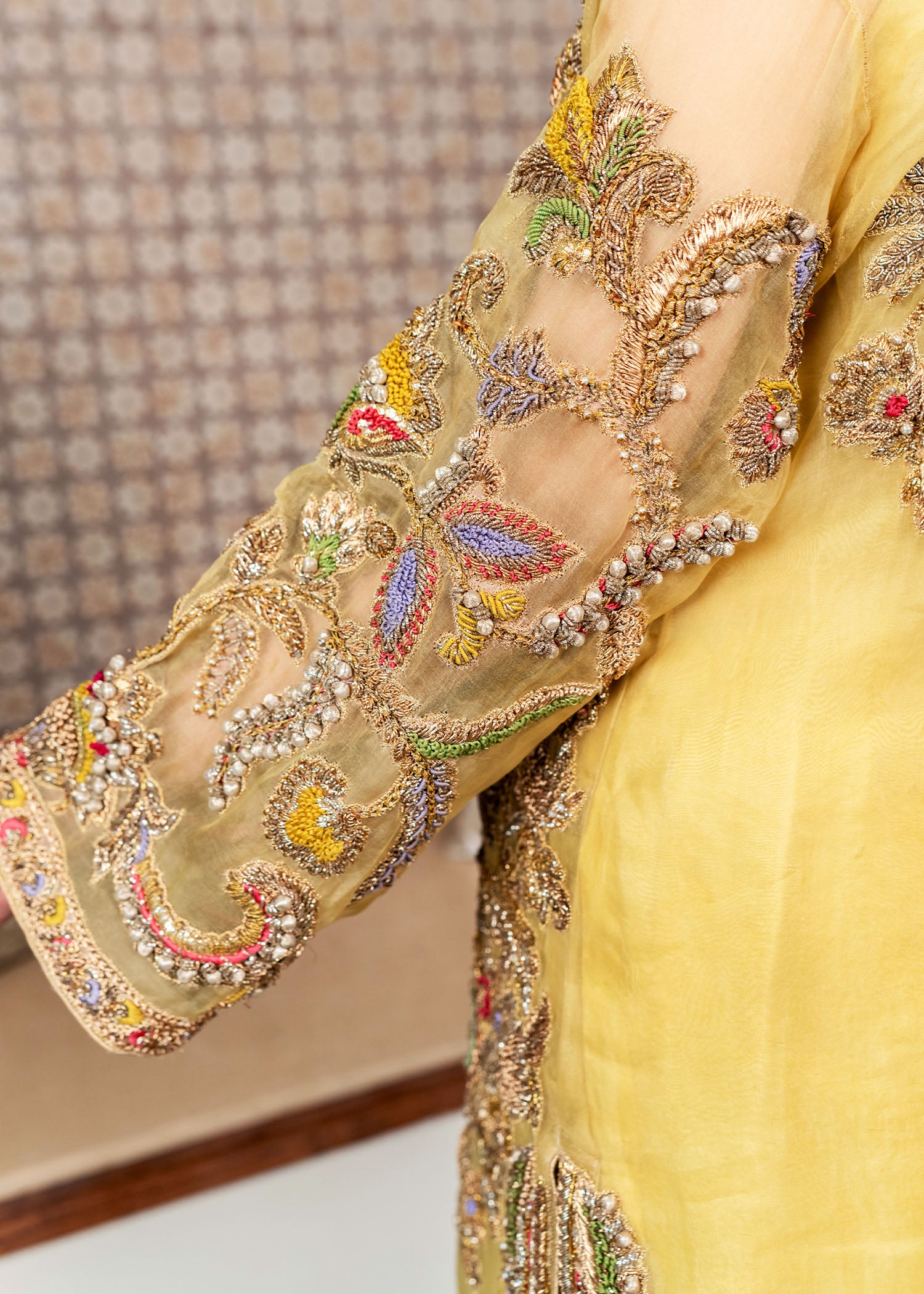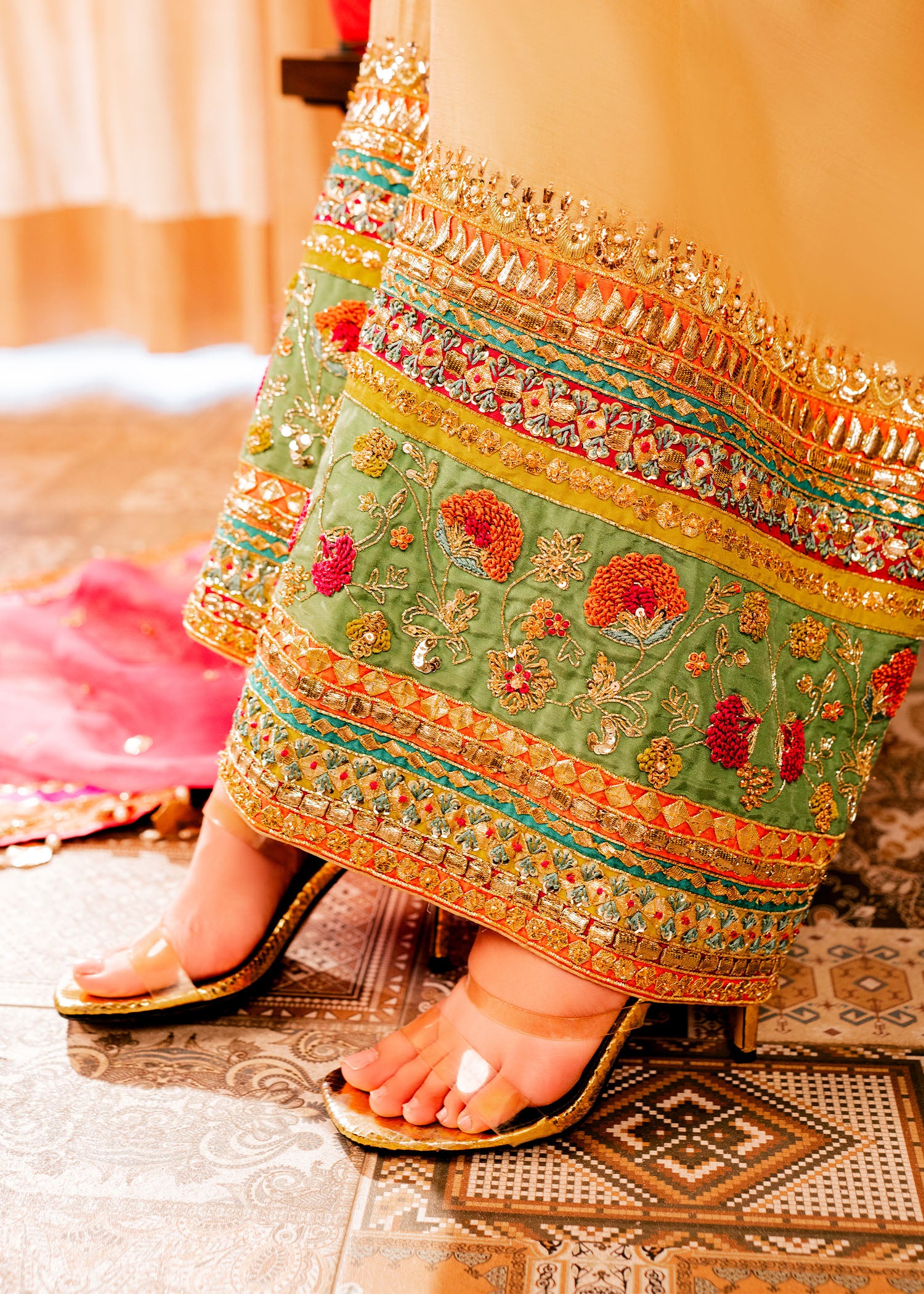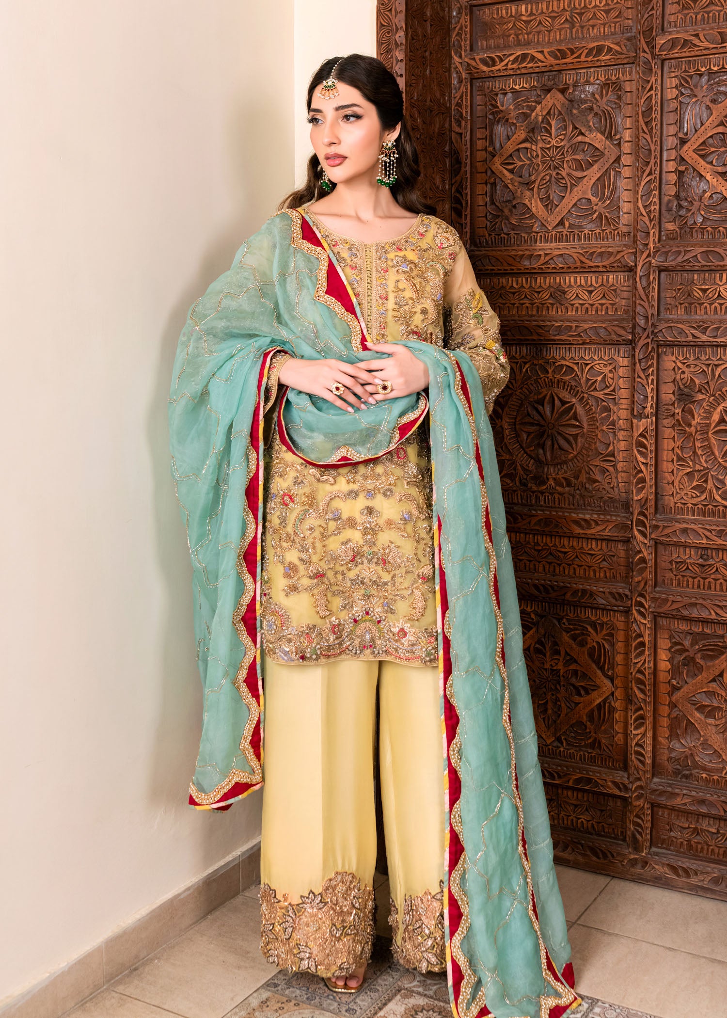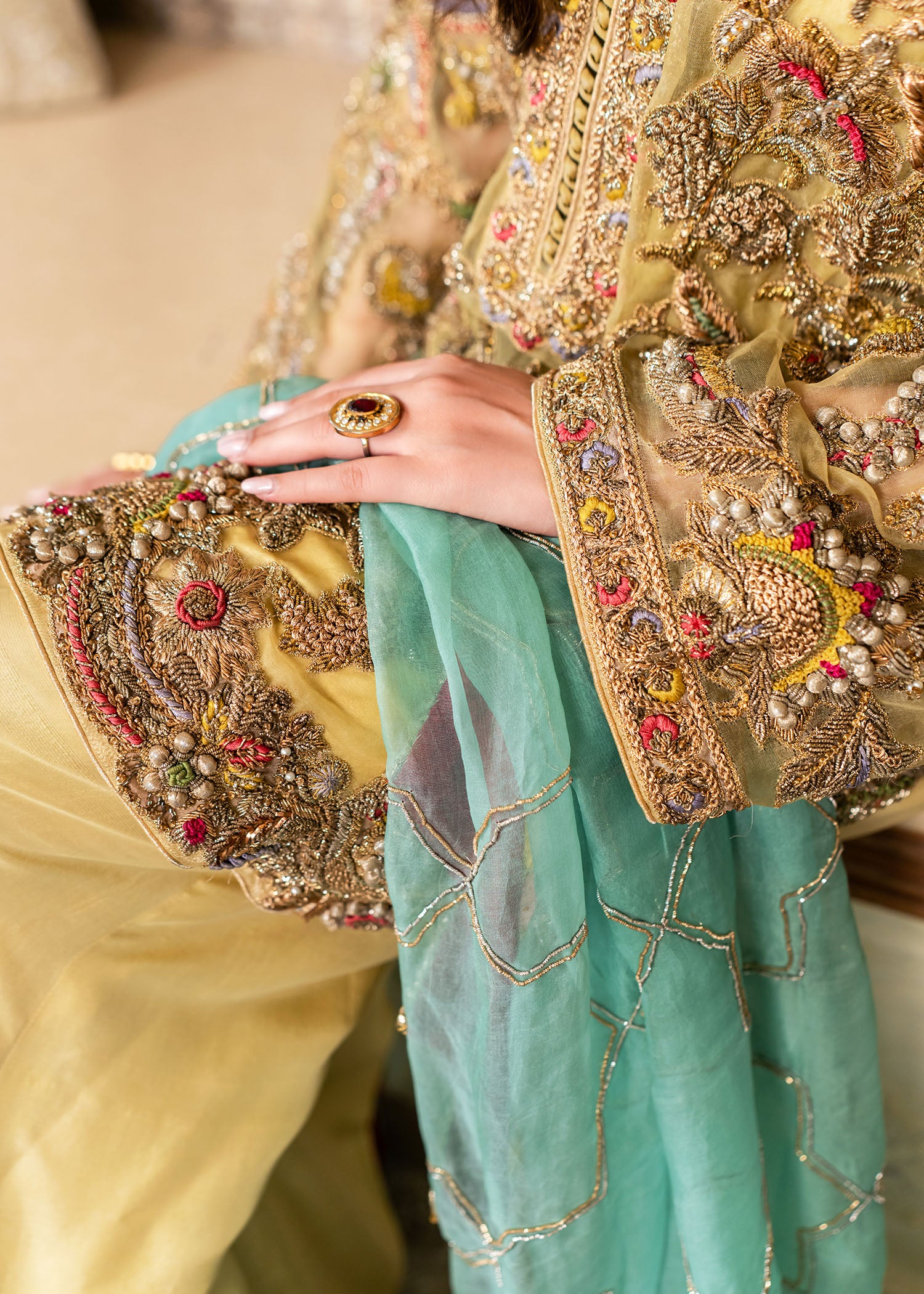 A statement ensemble crafted in a striking yellow base, paired with a contrasting candy mint dupatta accentuated with red hues. This timeless formal is entirely handcrafted using exquisite zardozi and gota work, showcasing artistry in every detail. Perfect for bridesmaids or wedding guests who wish to embrace tradition with a fresh, vibrant touch.