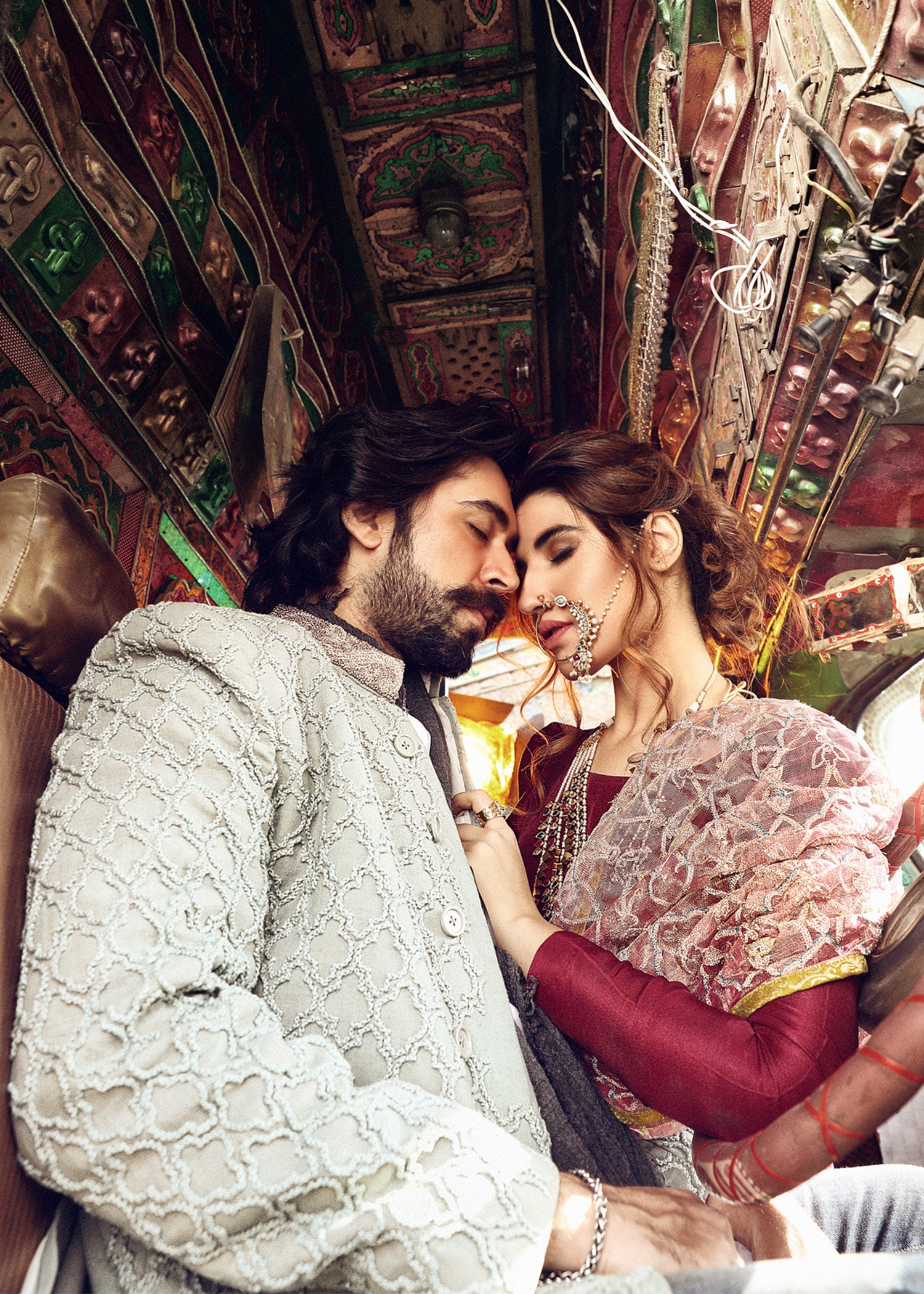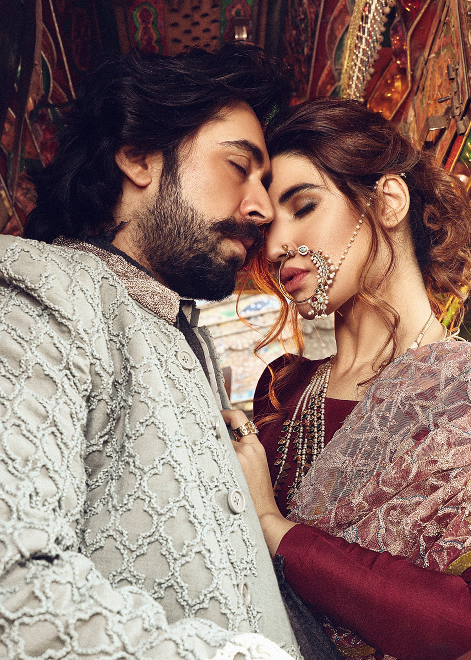 Radiant persimmon rawsilk lehnga, luxurious velvet top with dust and dark dupattas. Embellished with twisted gota, dabka lodes, techniques of nakshi, blinds of mukesh and pearls covered with with zari net.