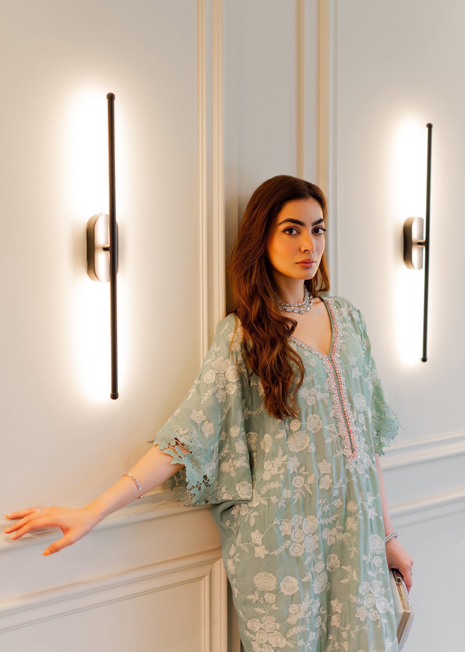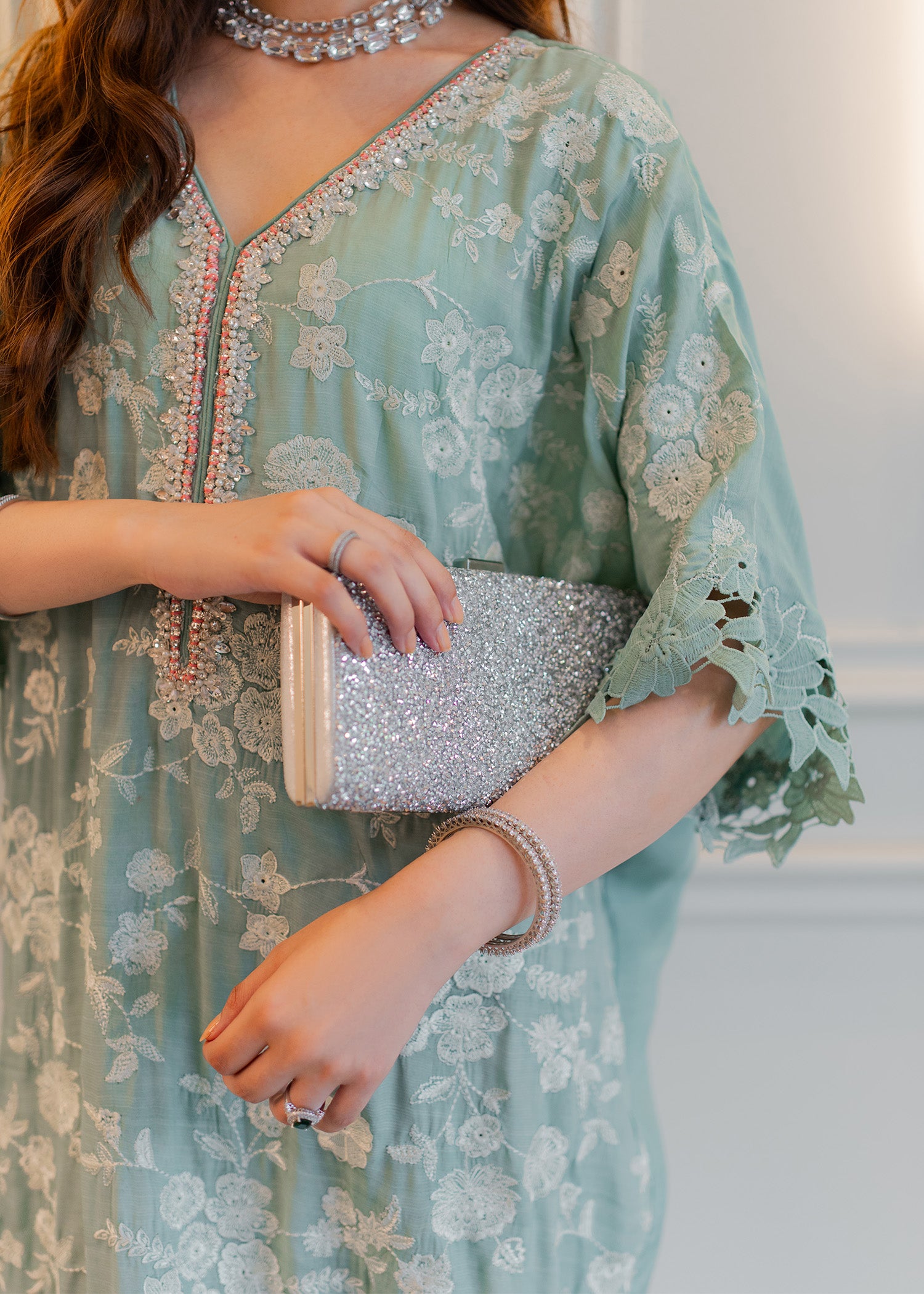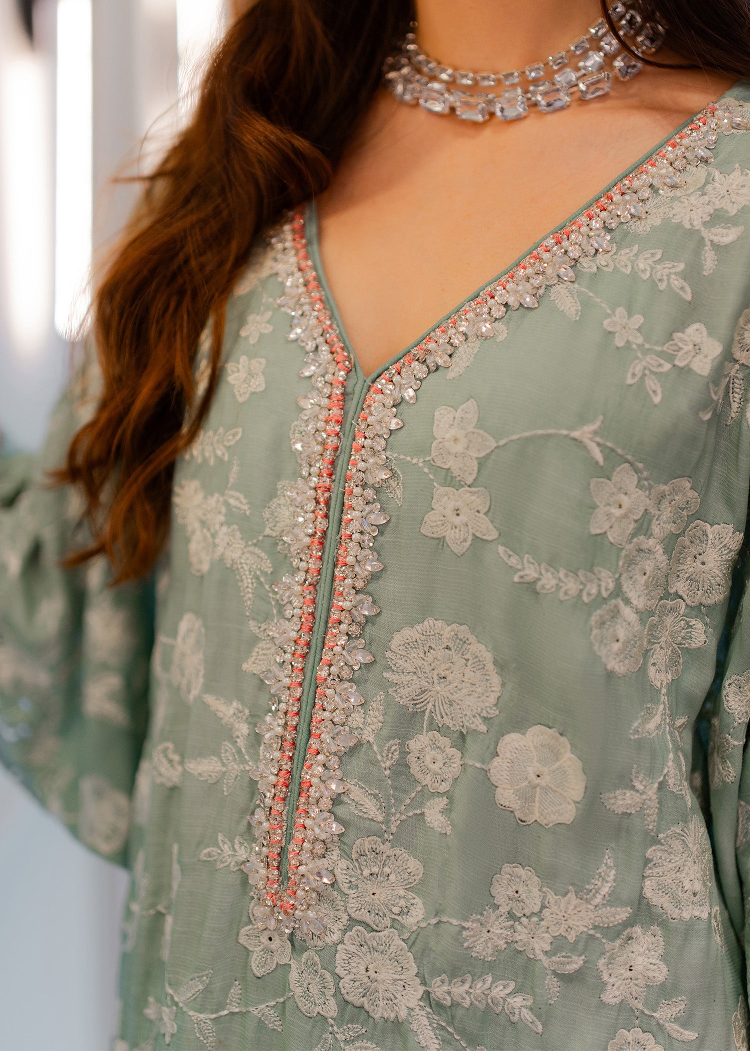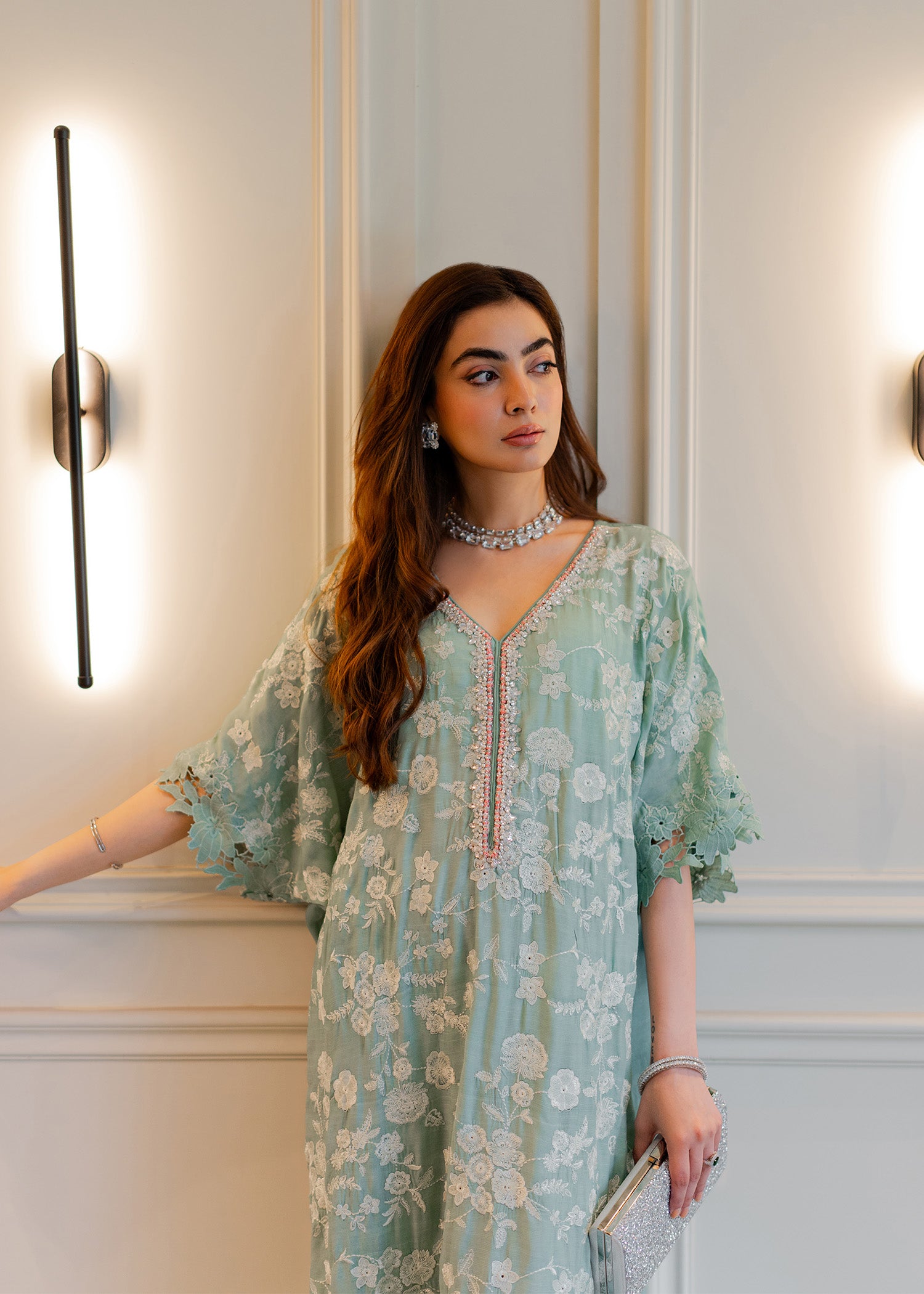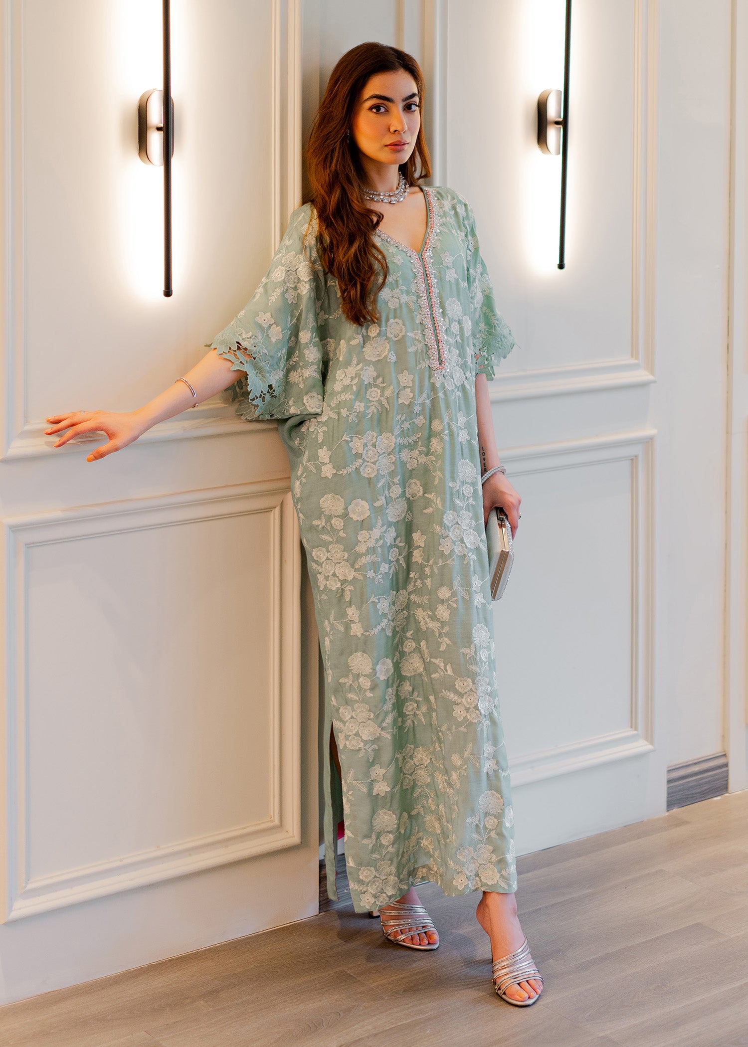 This mint green kaaftan elevated with intricate white embroidery, featuring a delicately hand-embellished neckline enhanced with contrast resham detailing. Lace-finished sleeves add a soft, feminine touch, while the fluid, flowy drape ensures effortless movement and ease