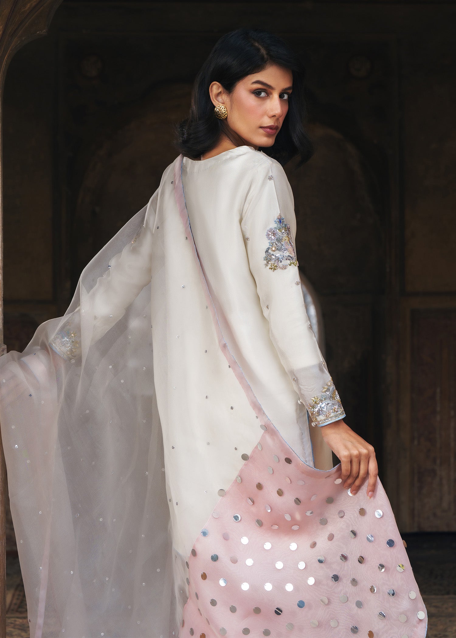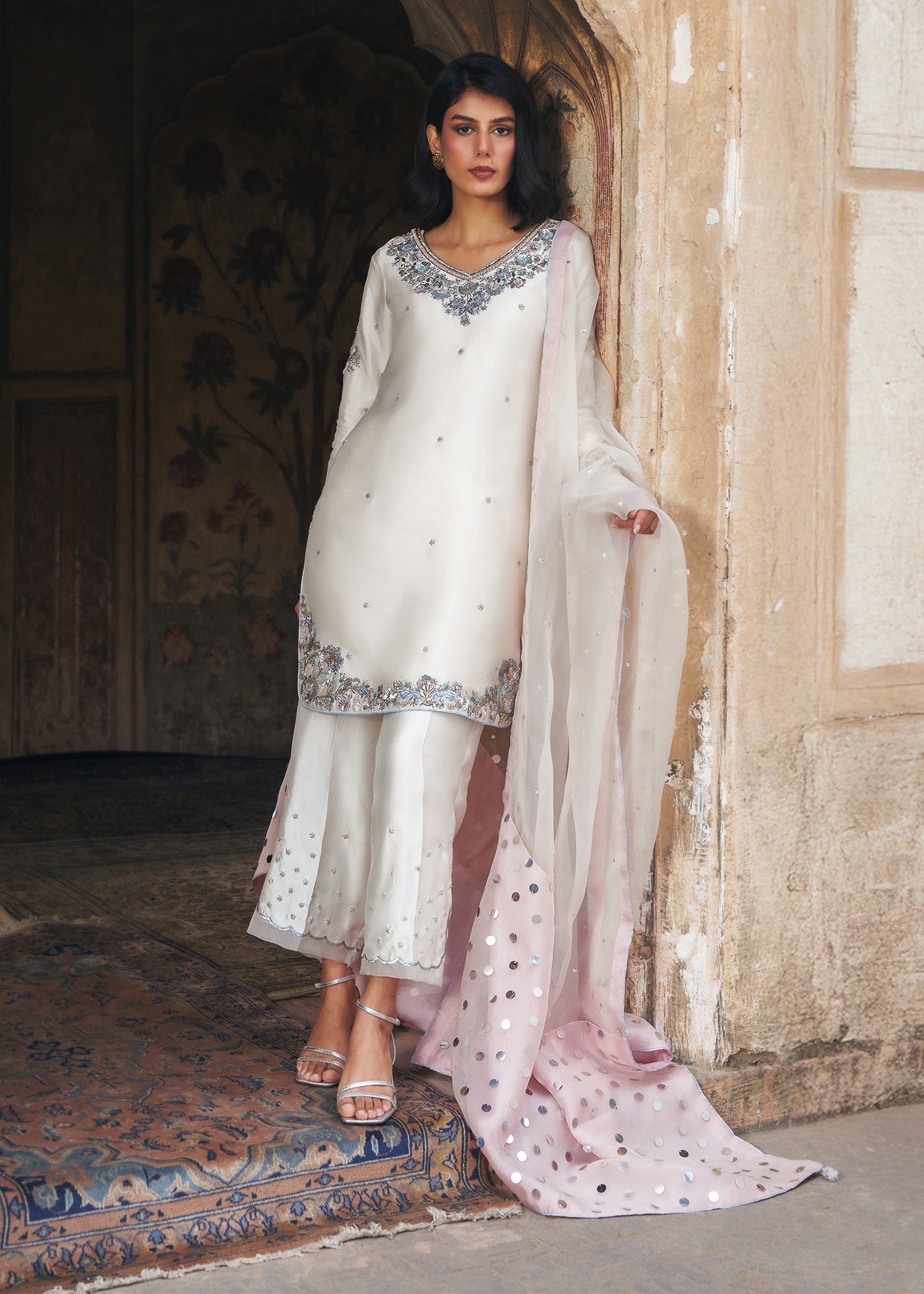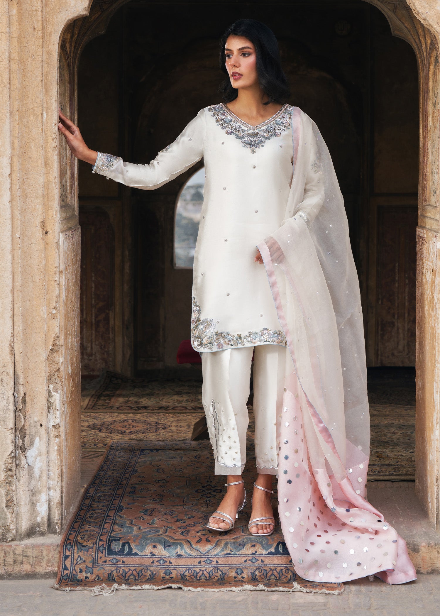 An ivory round short shirt, exquisitely crafted with a heavily embellished neckline and borders, complemented by a delicate all-over spray of handwork that adds subtle texture and elegance. Styled with azzaars featuring intricate organza appliqué enhanced with meticulous hand embellishment, the look is completed with a coordinating dupatta adorned with a shimmering sequin spray and finished with a soft pink contrast facing. This ensemble seamlessly combines timeless craftsmanship, layered detailing, and modern refinement, creating a statement outfit for festive celebrations and formal occasions.