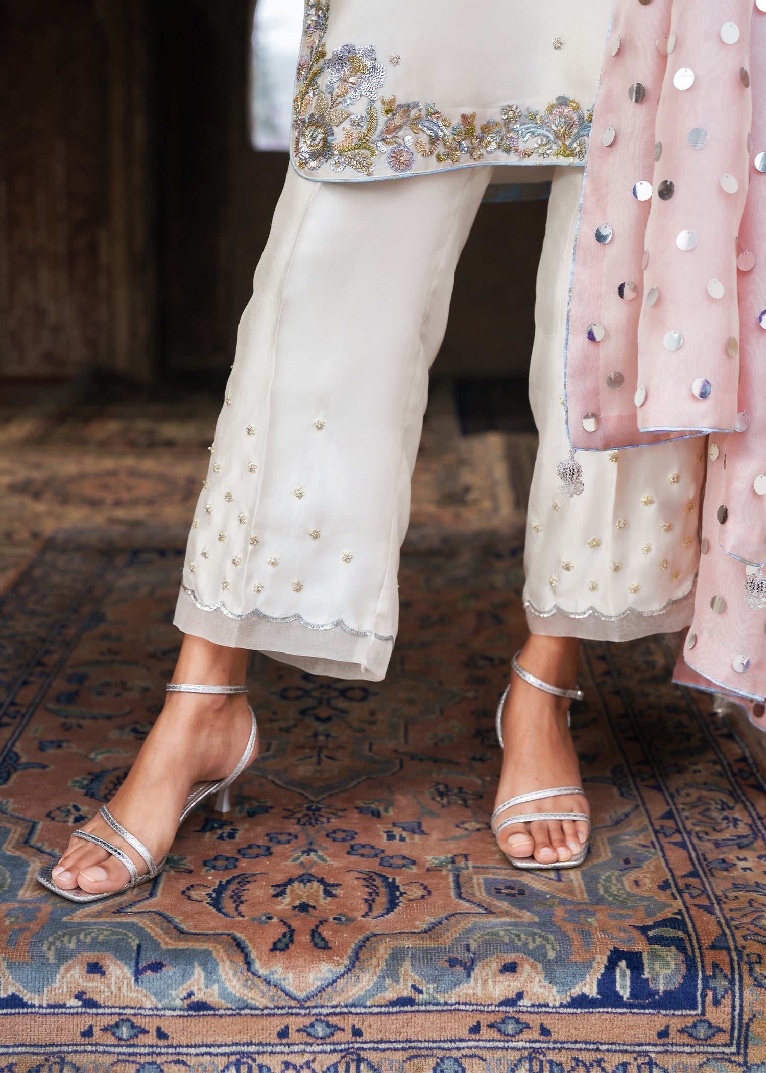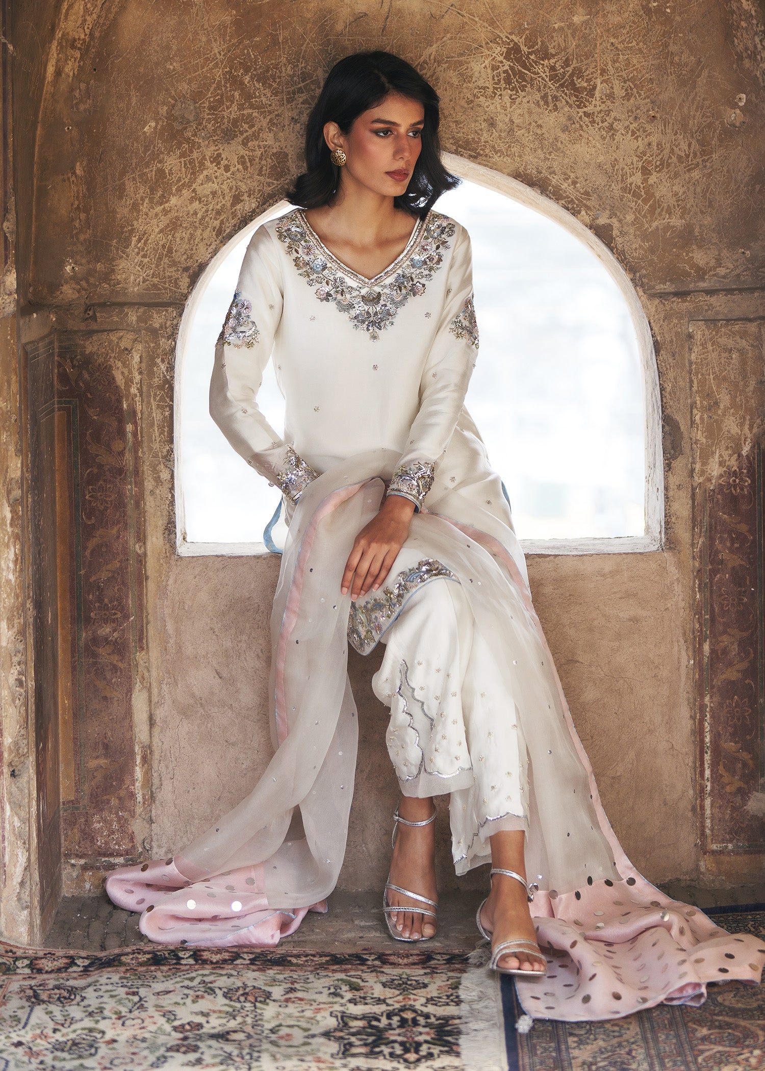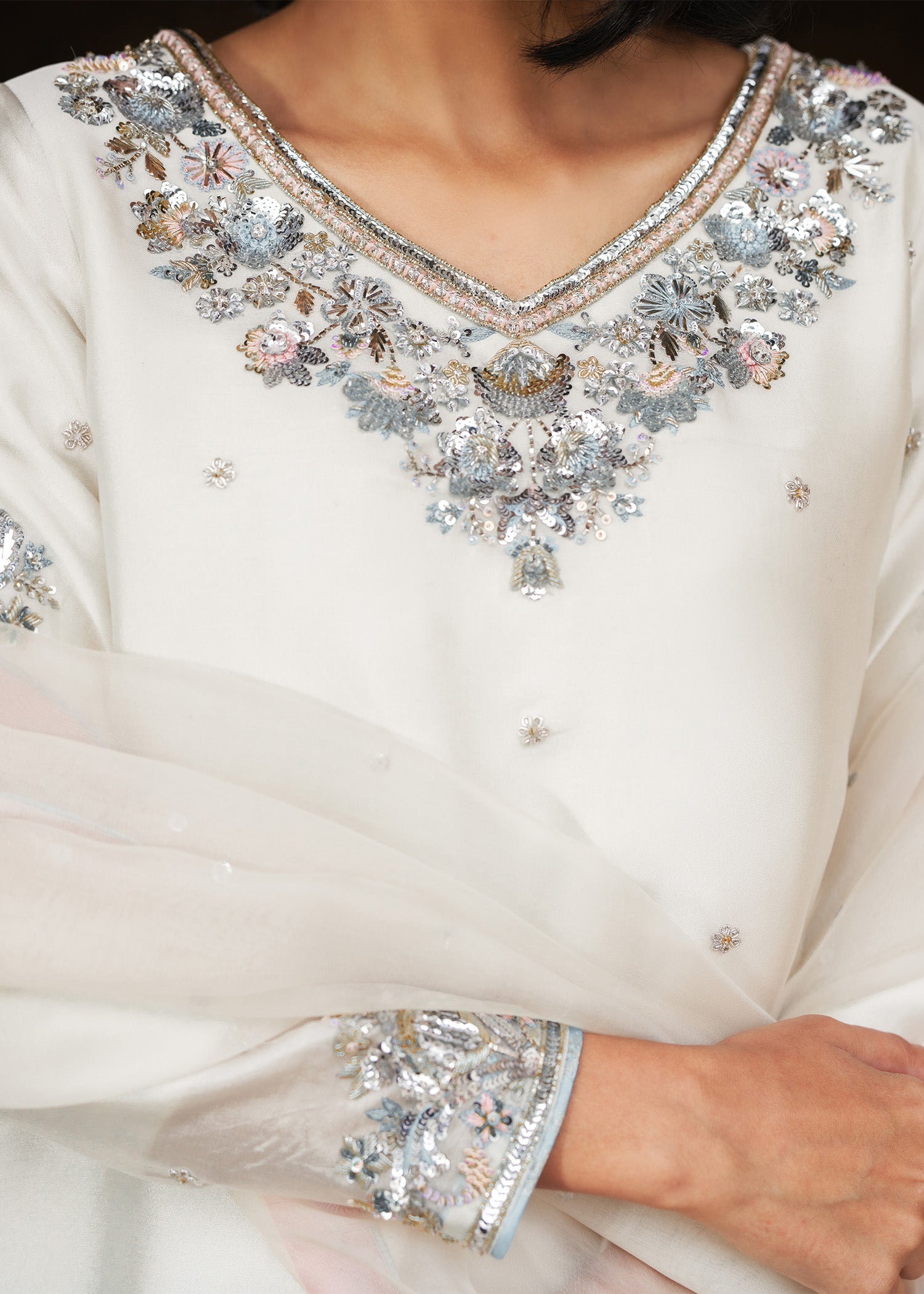 An ivory round short shirt, exquisitely crafted with a heavily embellished neckline and borders, complemented by a delicate all-over spray of handwork that adds subtle texture and elegance. Styled with azzaars featuring intricate organza appliqué enhanced with meticulous hand embellishment, the look is completed with a coordinating dupatta adorned with a shimmering sequin spray and finished with a soft pink contrast facing. This ensemble seamlessly combines timeless craftsmanship, layered detailing, and modern refinement, creating a statement outfit for festive celebrations and formal occasions.