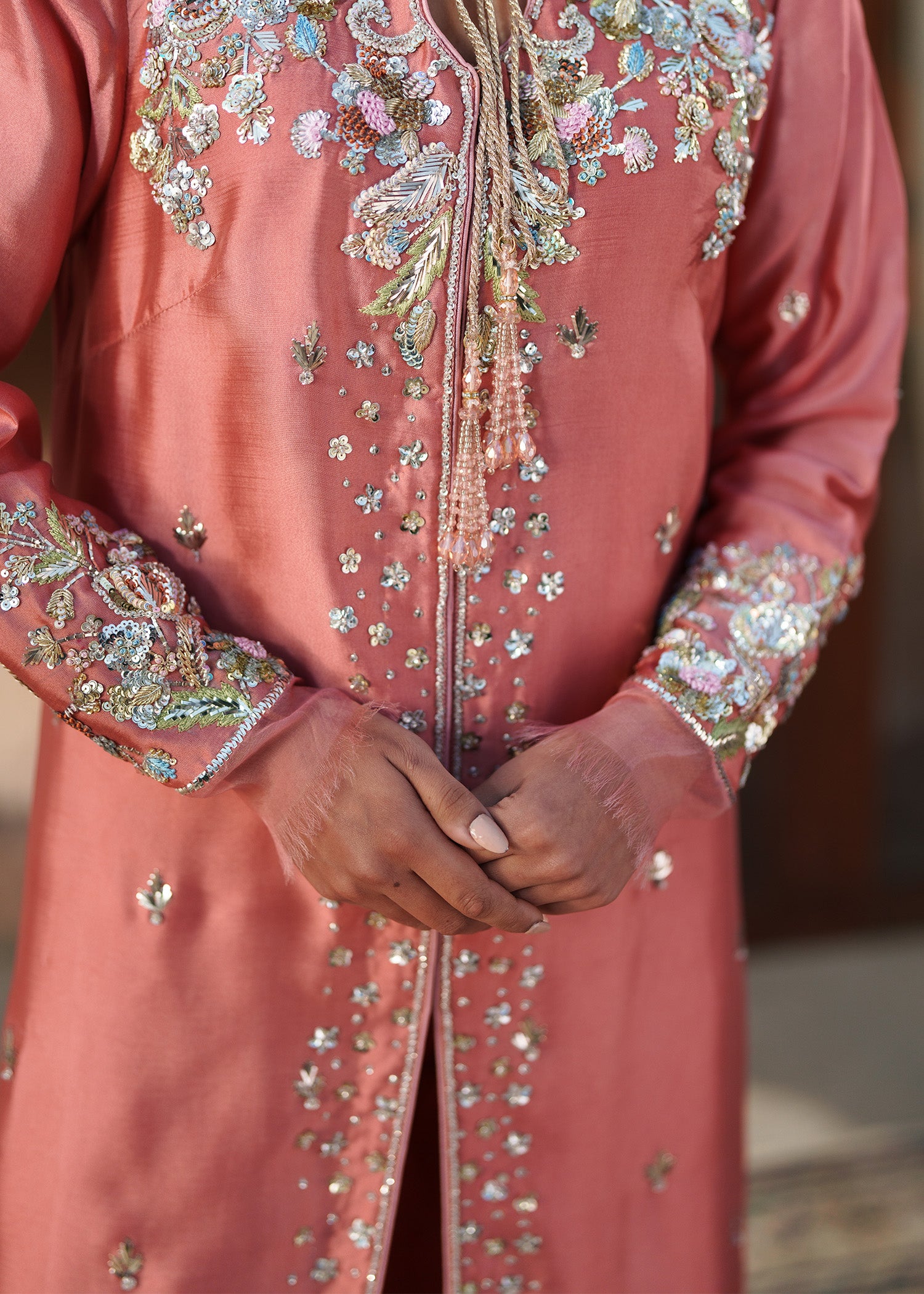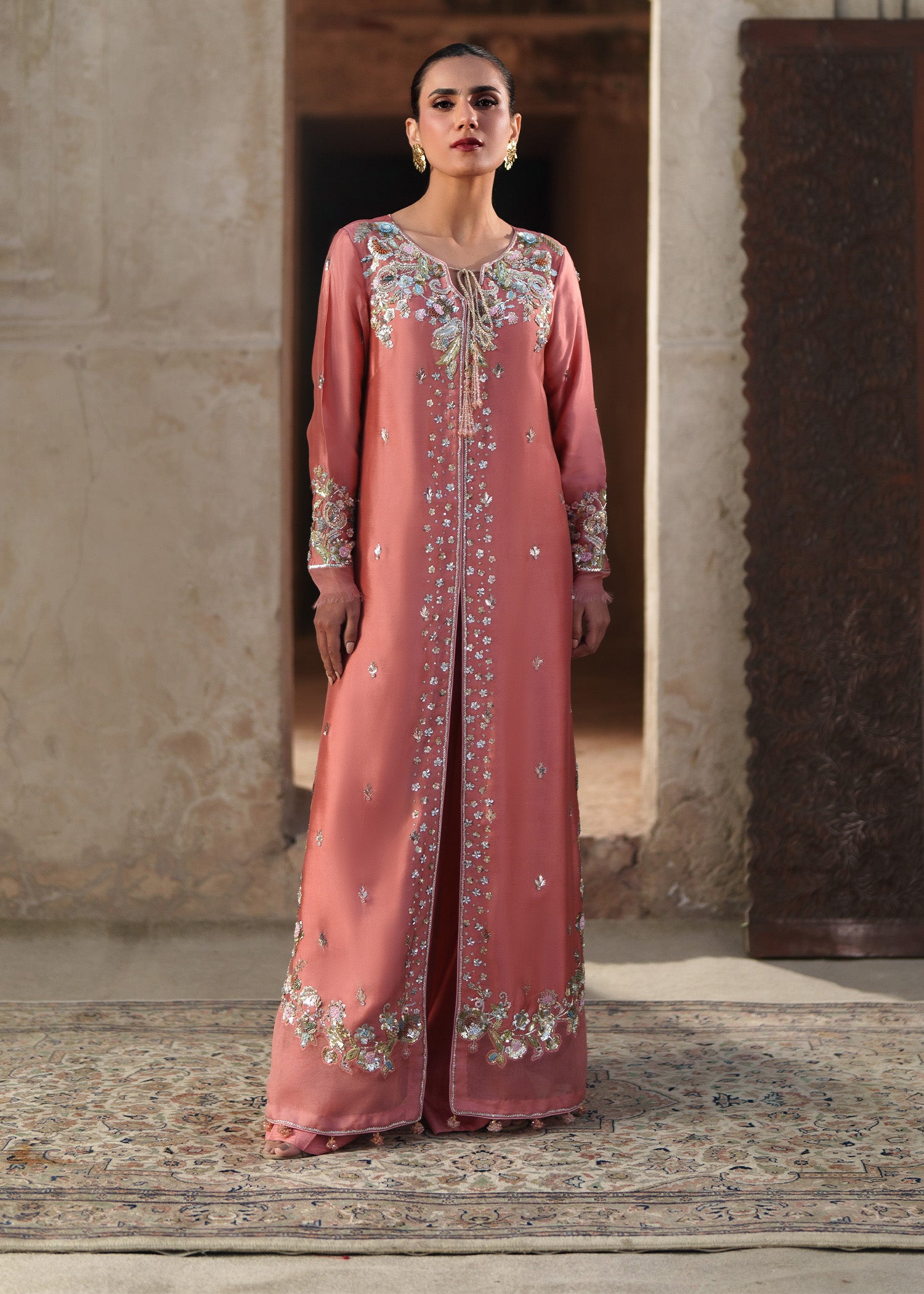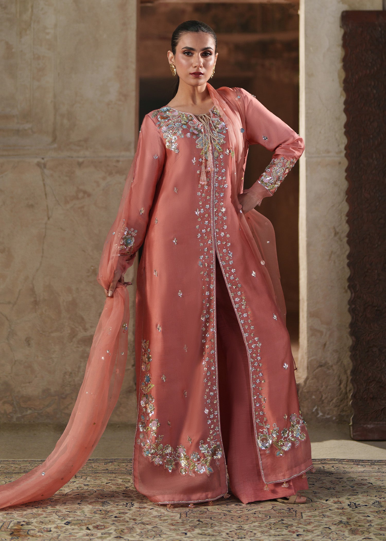 A coral pink long front-open jacket, delicately patterned with small floral motifs and framed by richly hand-worked borders usig resham, sequins, mukesh, naqshi and dabka. The statement neckline is intricately embellished, adding depth and quiet opulence to the silhouette. Styled with clean, plain trousers and a coordinating dupatta adorned with soft floral accents, this ensemble brings together modern refinement and artisanal craftsmanship in effortless harmony.