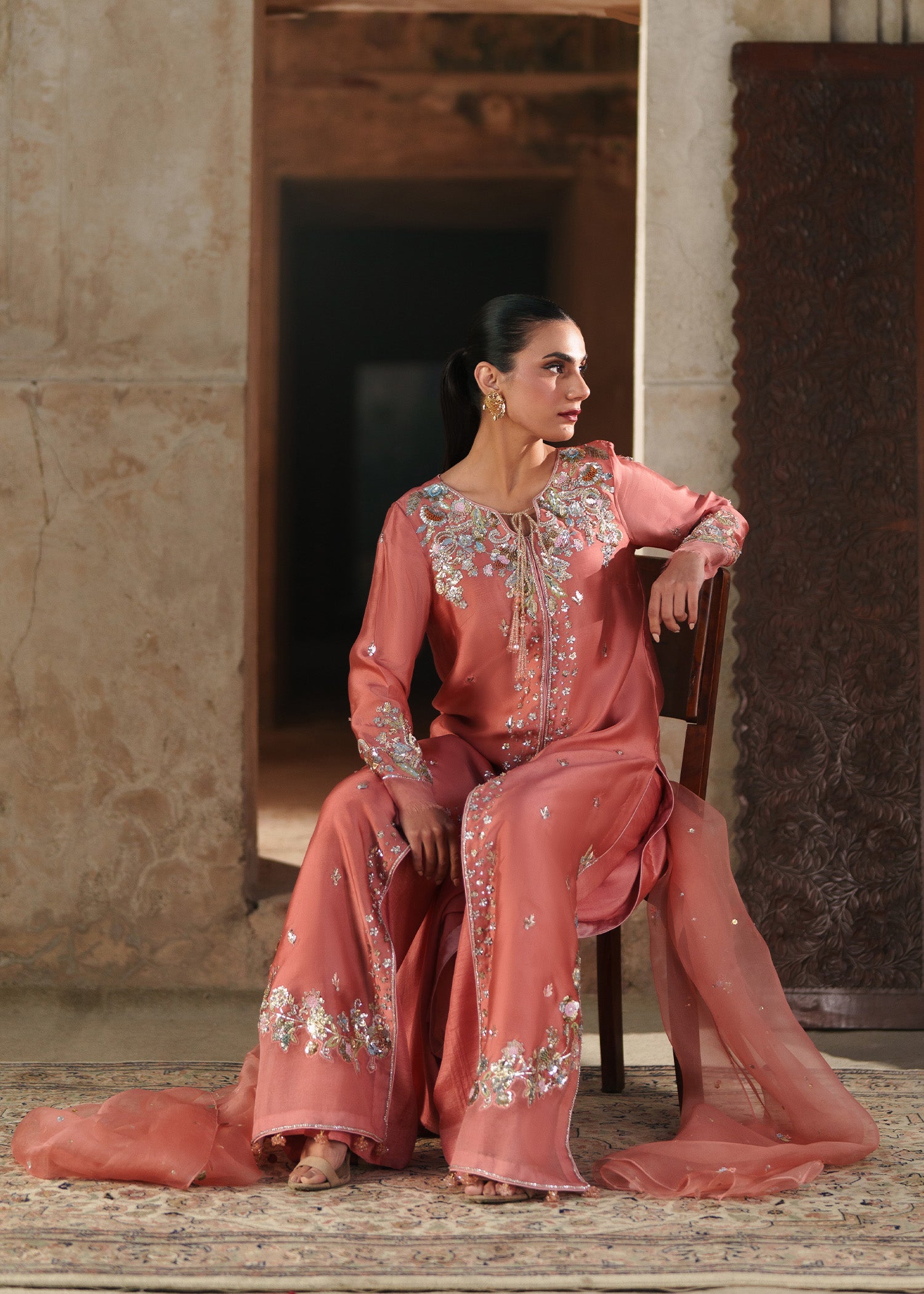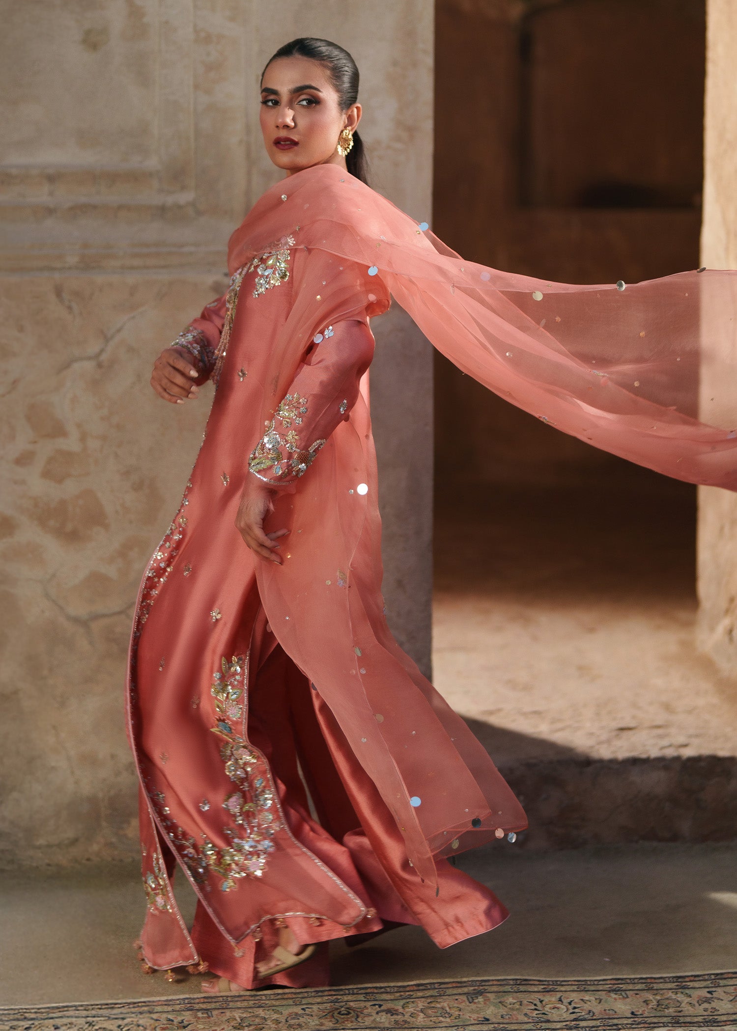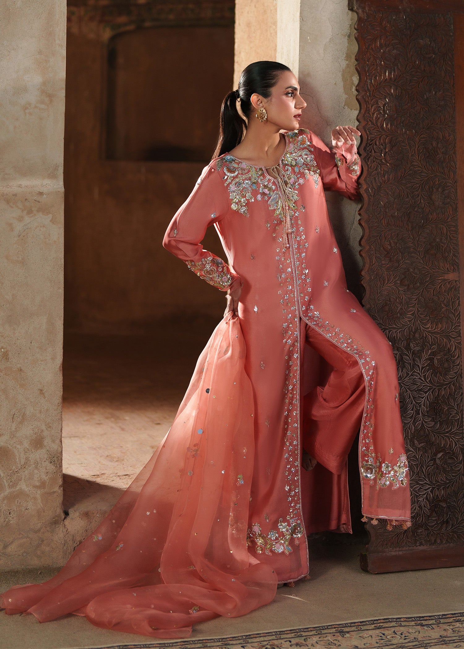 A coral pink long front-open jacket, delicately patterned with small floral motifs and framed by richly hand-worked borders usig resham, sequins, mukesh, naqshi and dabka. The statement neckline is intricately embellished, adding depth and quiet opulence to the silhouette. Styled with clean, plain trousers and a coordinating dupatta adorned with soft floral accents, this ensemble brings together modern refinement and artisanal craftsmanship in effortless harmony.