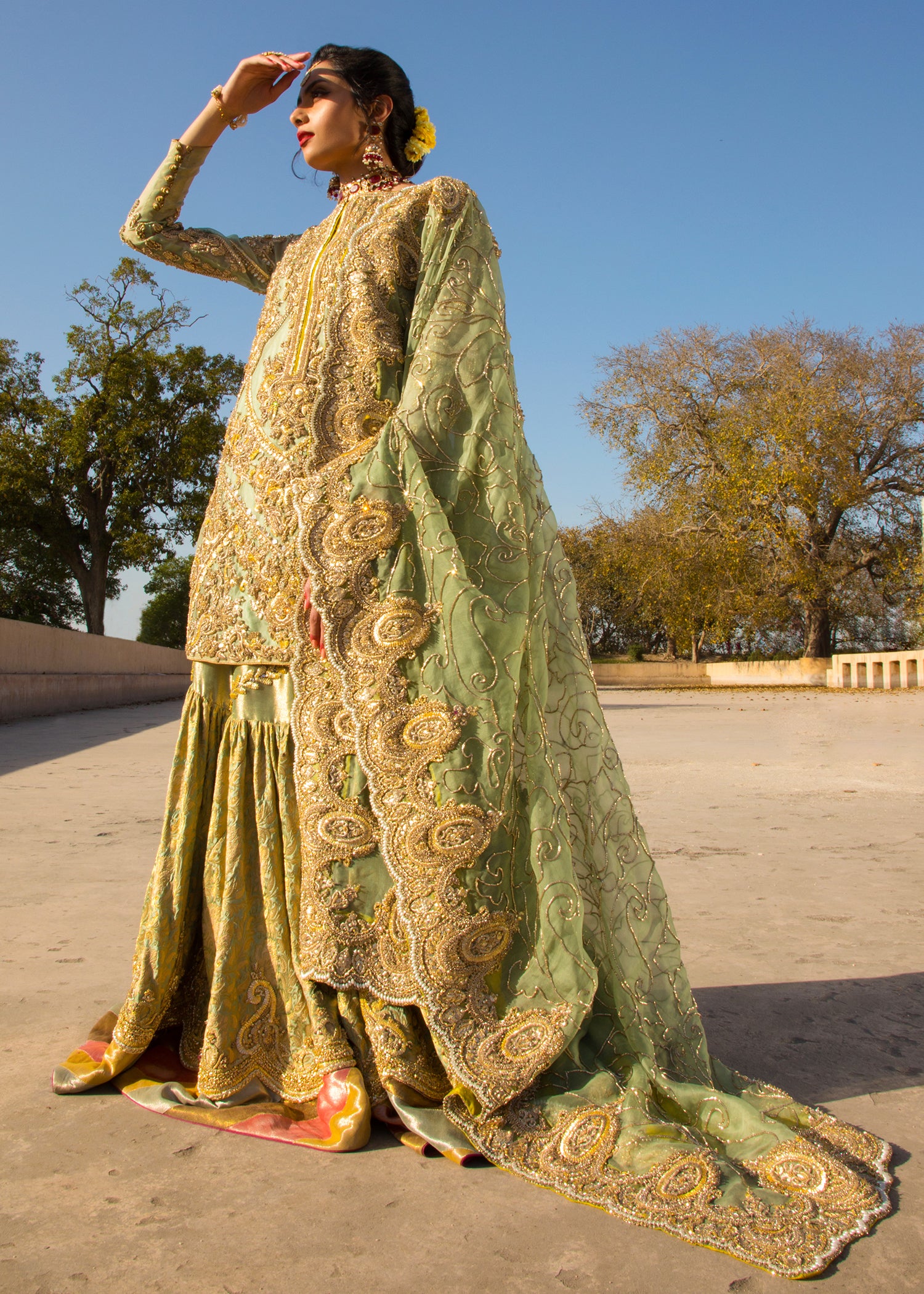 Delicately crafted with bright, sparkles and shine this dreamy colour palette katan organza top with beautifully enhanced Kashmiri pattern on drape, Zari tissue merged with kamkhab gharara trimmed with Indian tissue chatapati. Meticulously handcrafted with sequins, Crystals, pearls, Gota, Nakshi, pati, pearls, sheesha, Cora, Dabka and Pipes.