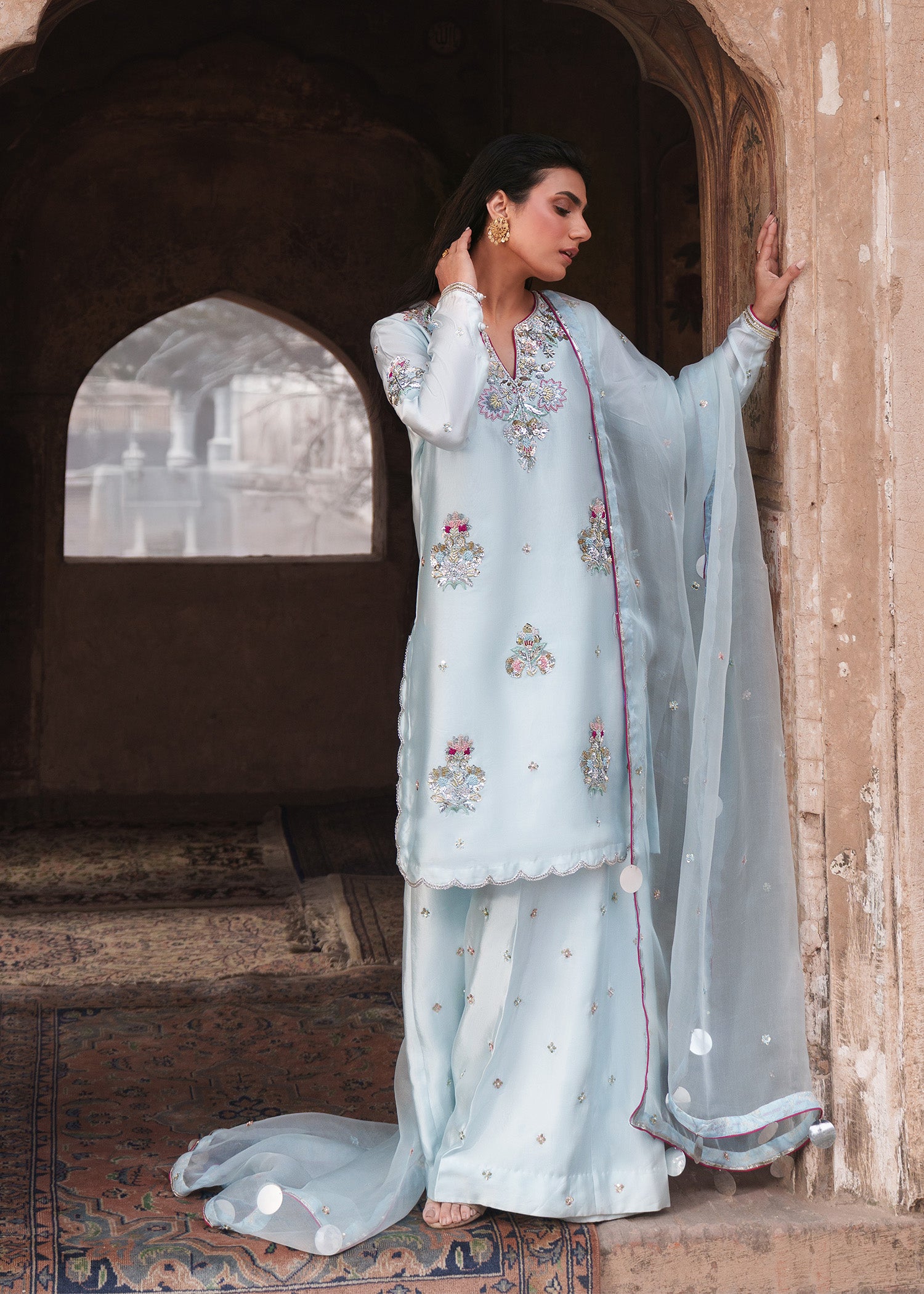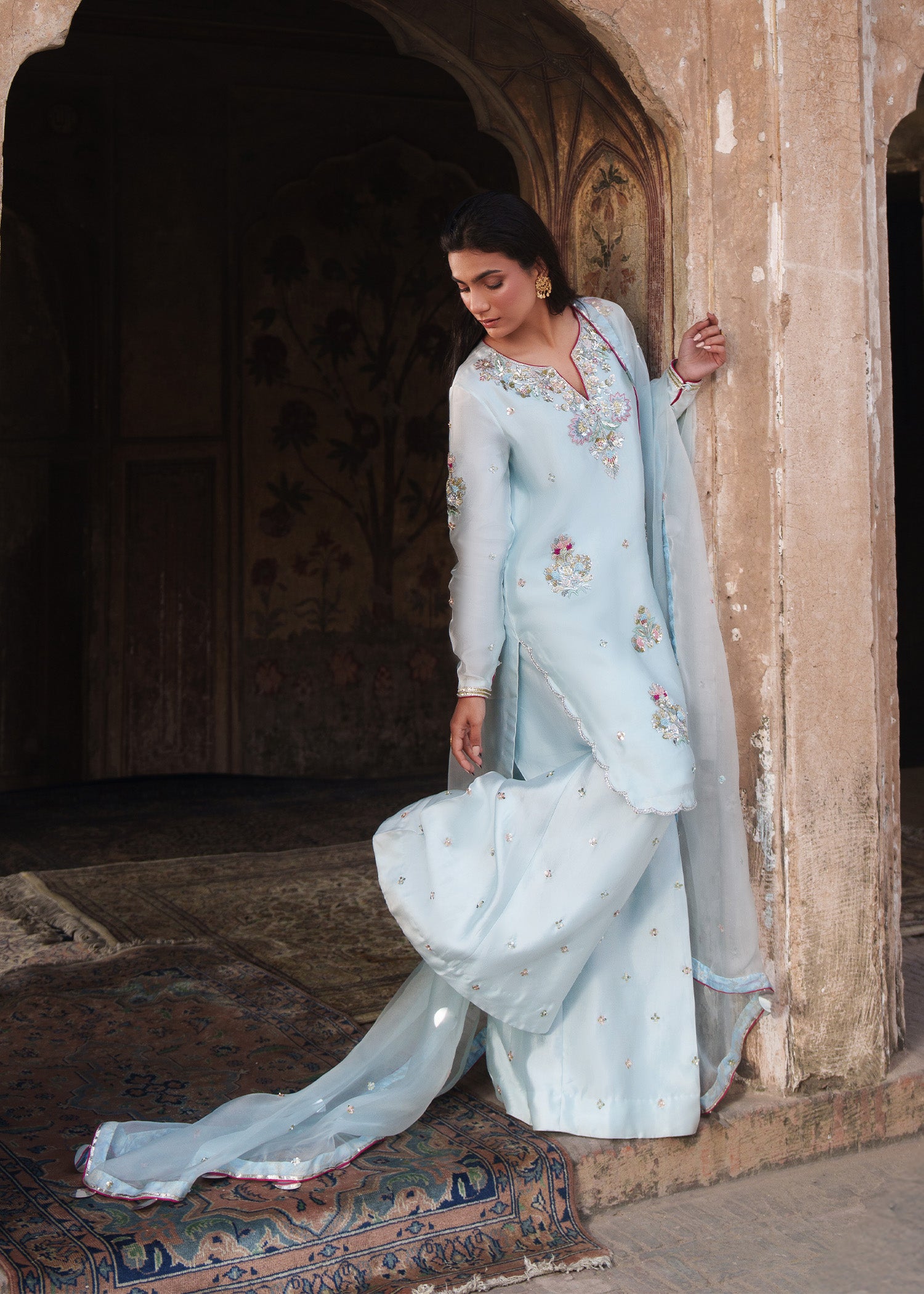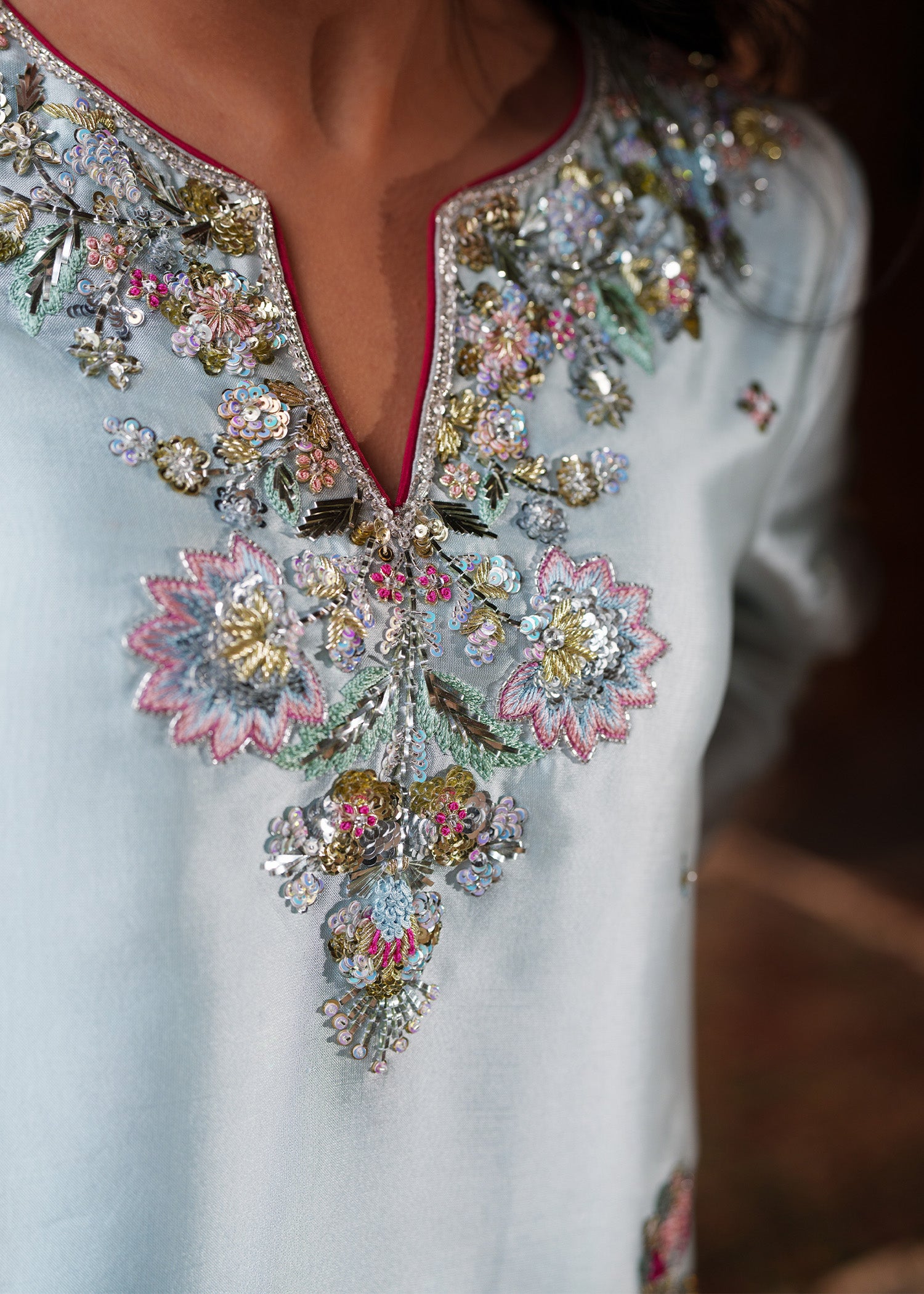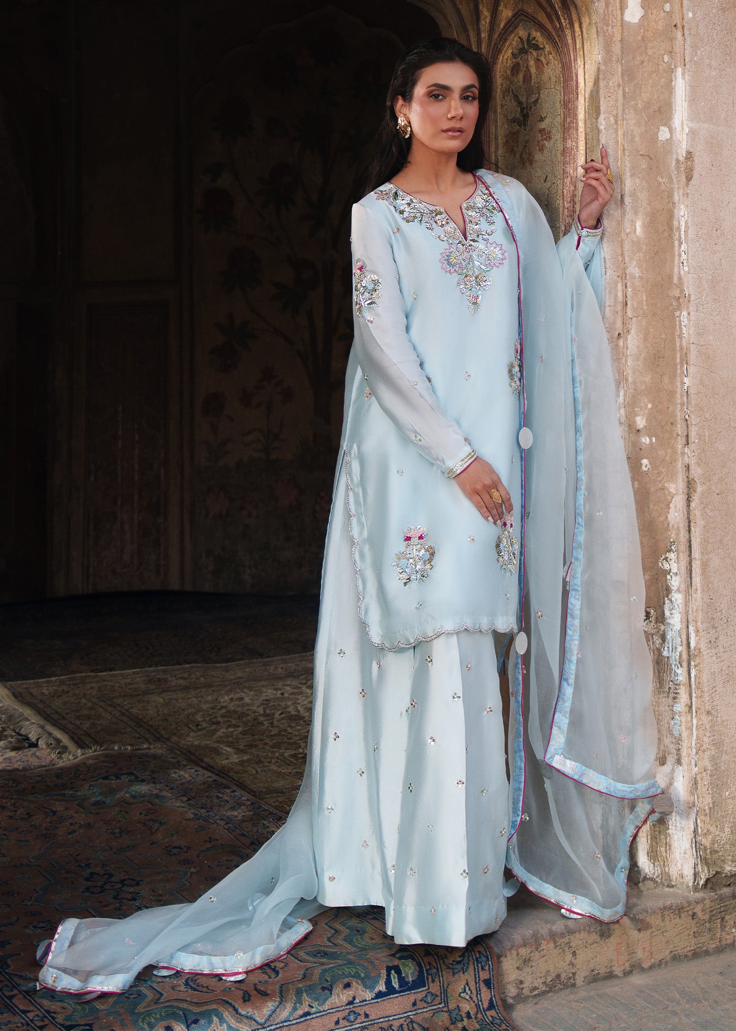 An ice-blue shirt adorned with delicate floral motifs across the front and sleeves with heavily hand embellished neckline, enhanced with contrasting pink resham that elevates the intricate zardozi work. Styled with loose trousers and a dupatta featuring a subtle sequin spray, finished with khamkhab detailing and contrast piping, this ensemble exudes a harmonious blend of refined craftsmanship and contemporary elegance.