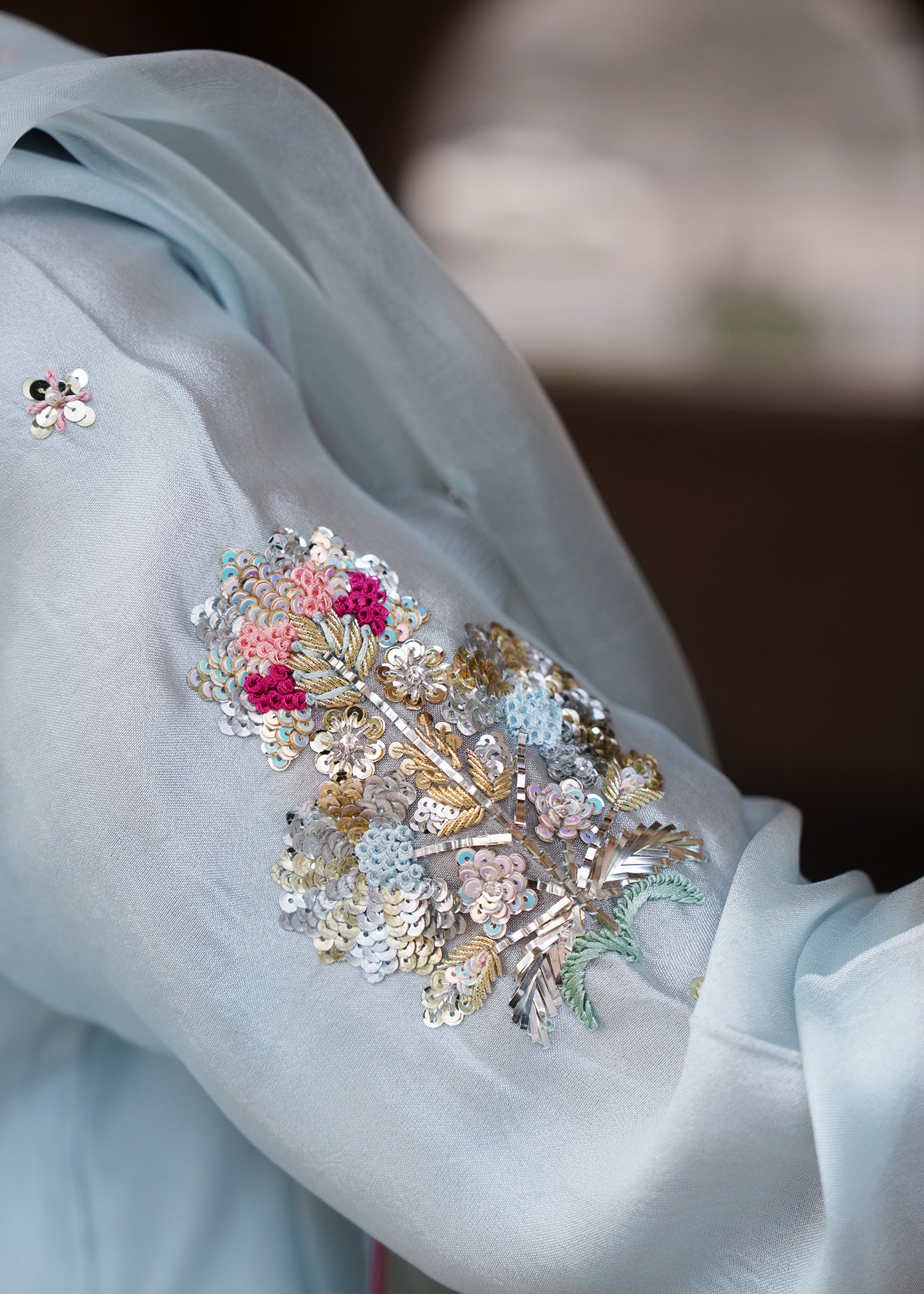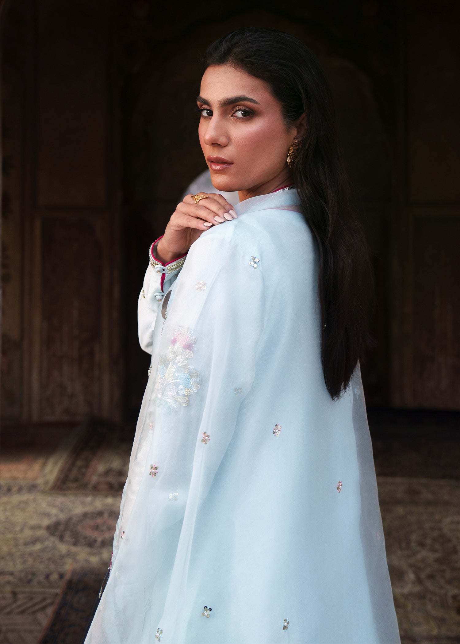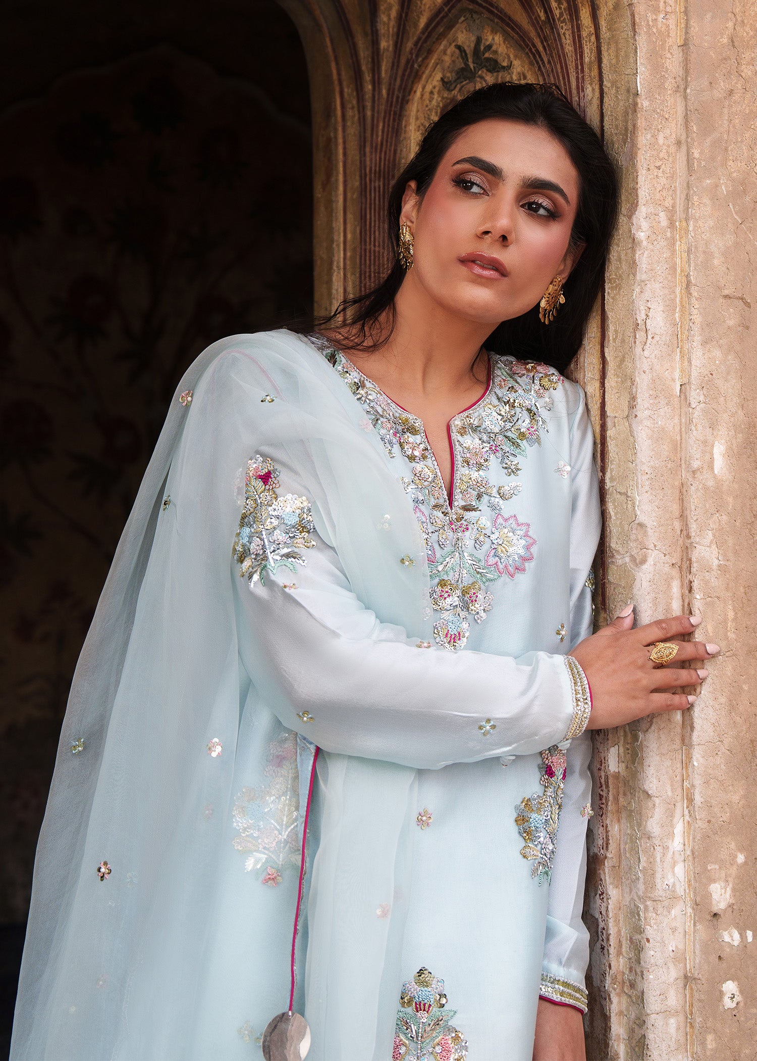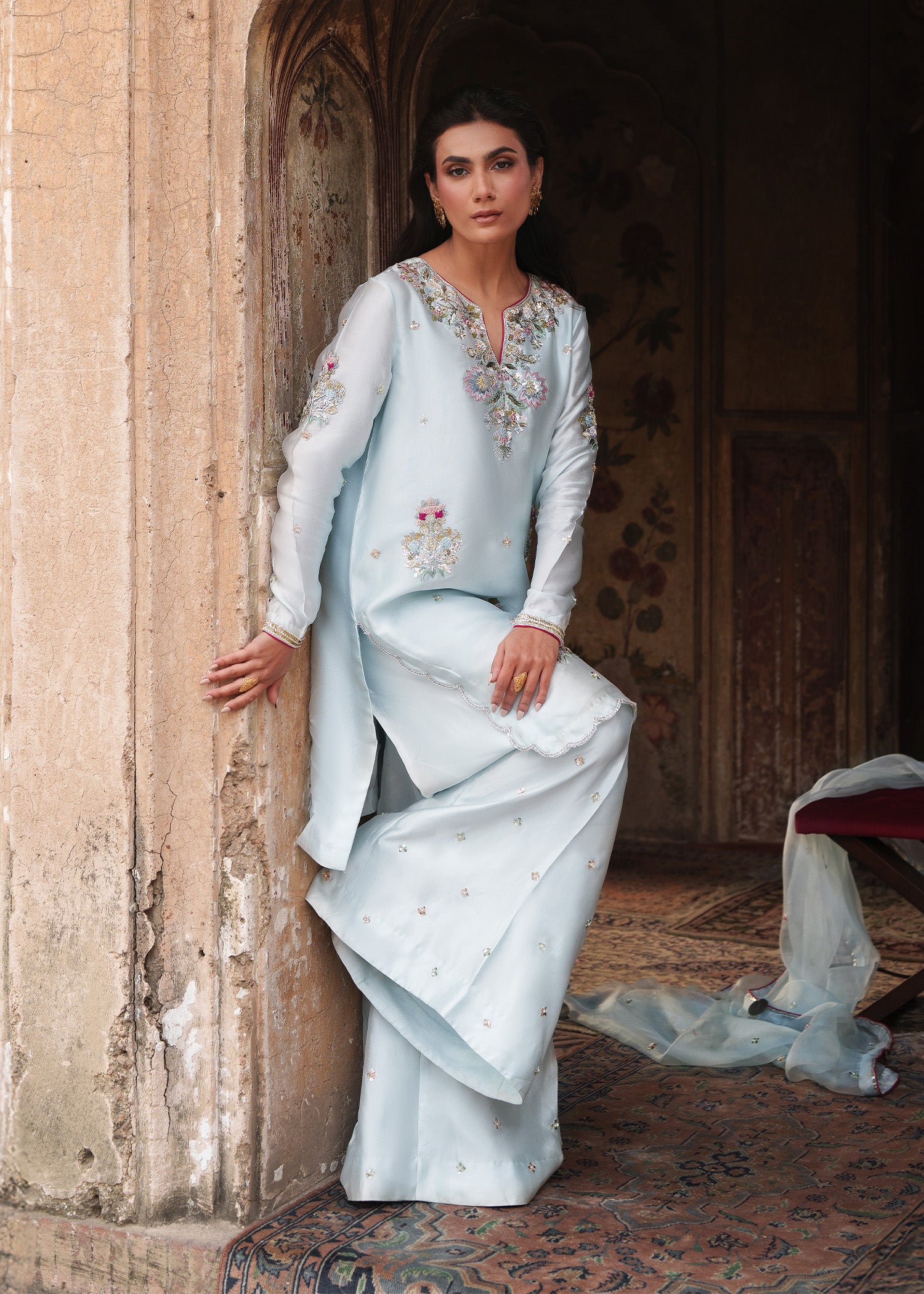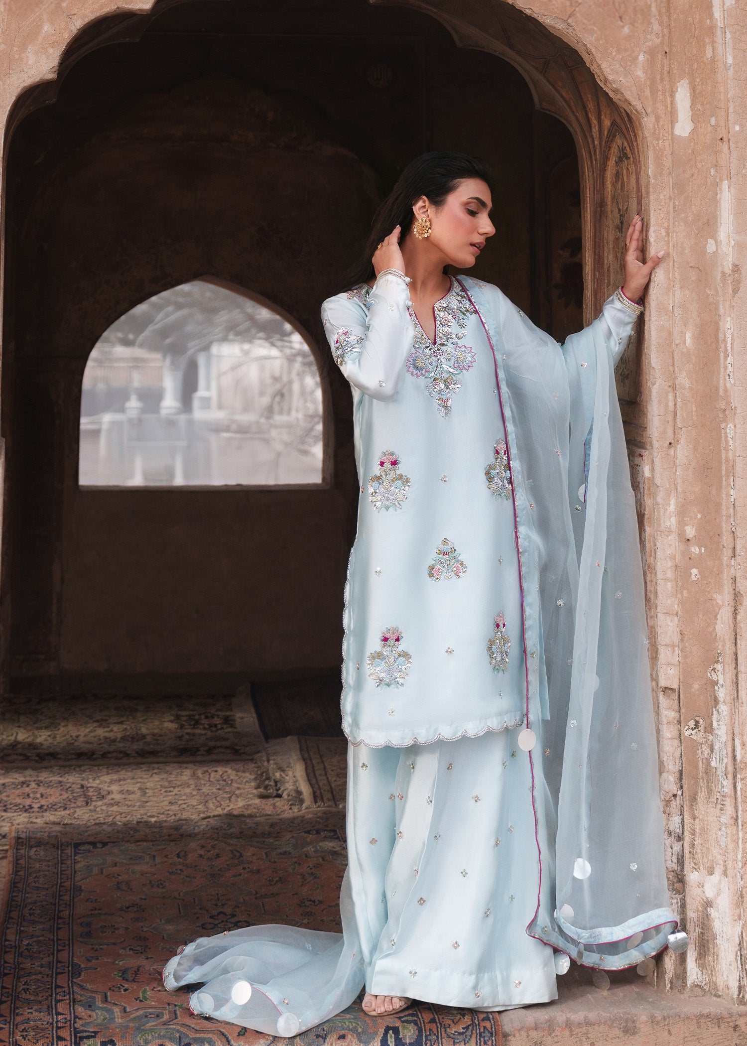 An ice-blue shirt adorned with delicate floral motifs across the front and sleeves with heavily hand embellished neckline, enhanced with contrasting pink resham that elevates the intricate zardozi work. Styled with loose trousers and a dupatta featuring a subtle sequin spray, finished with khamkhab detailing and contrast piping, this ensemble exudes a harmonious blend of refined craftsmanship and contemporary elegance.