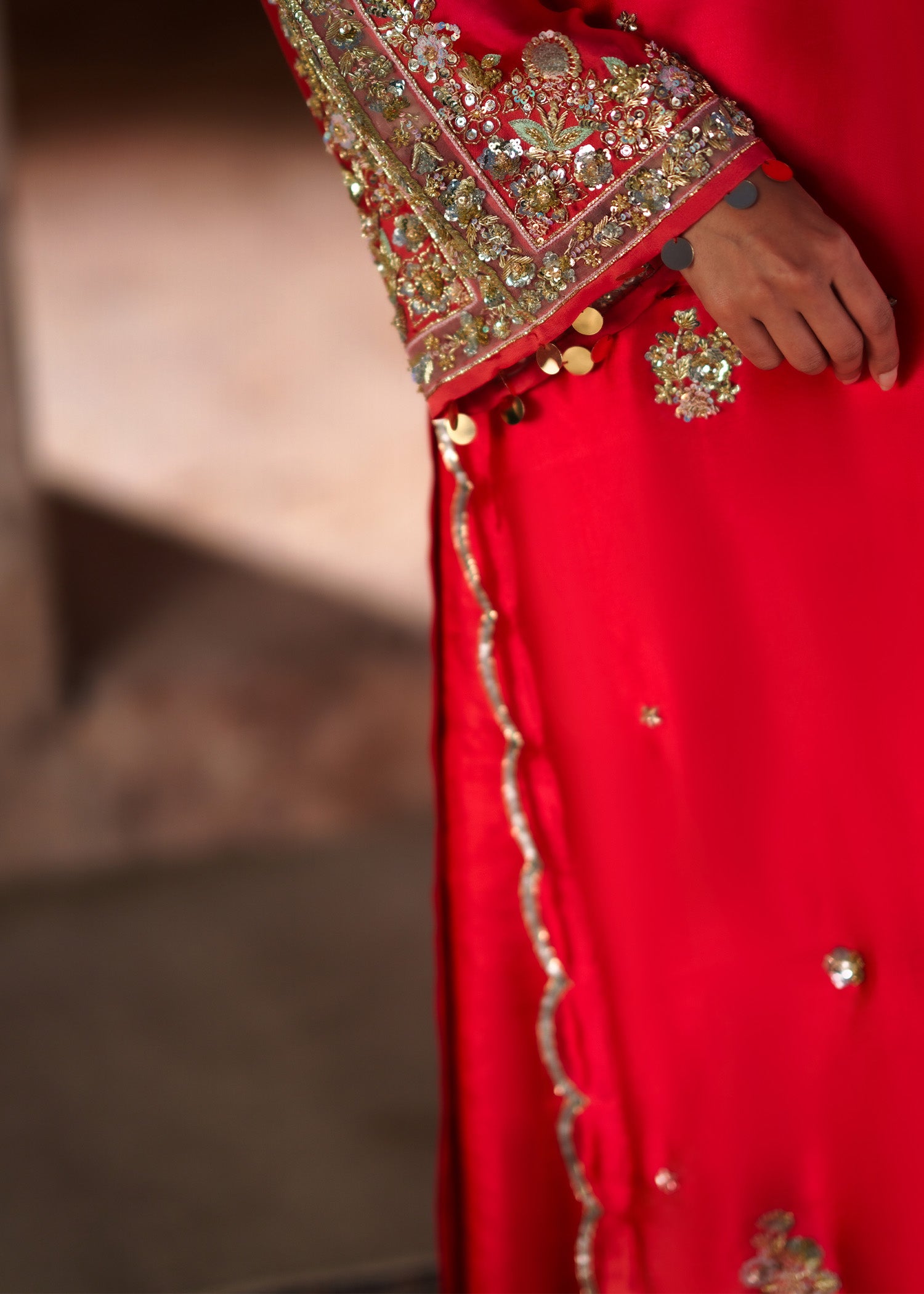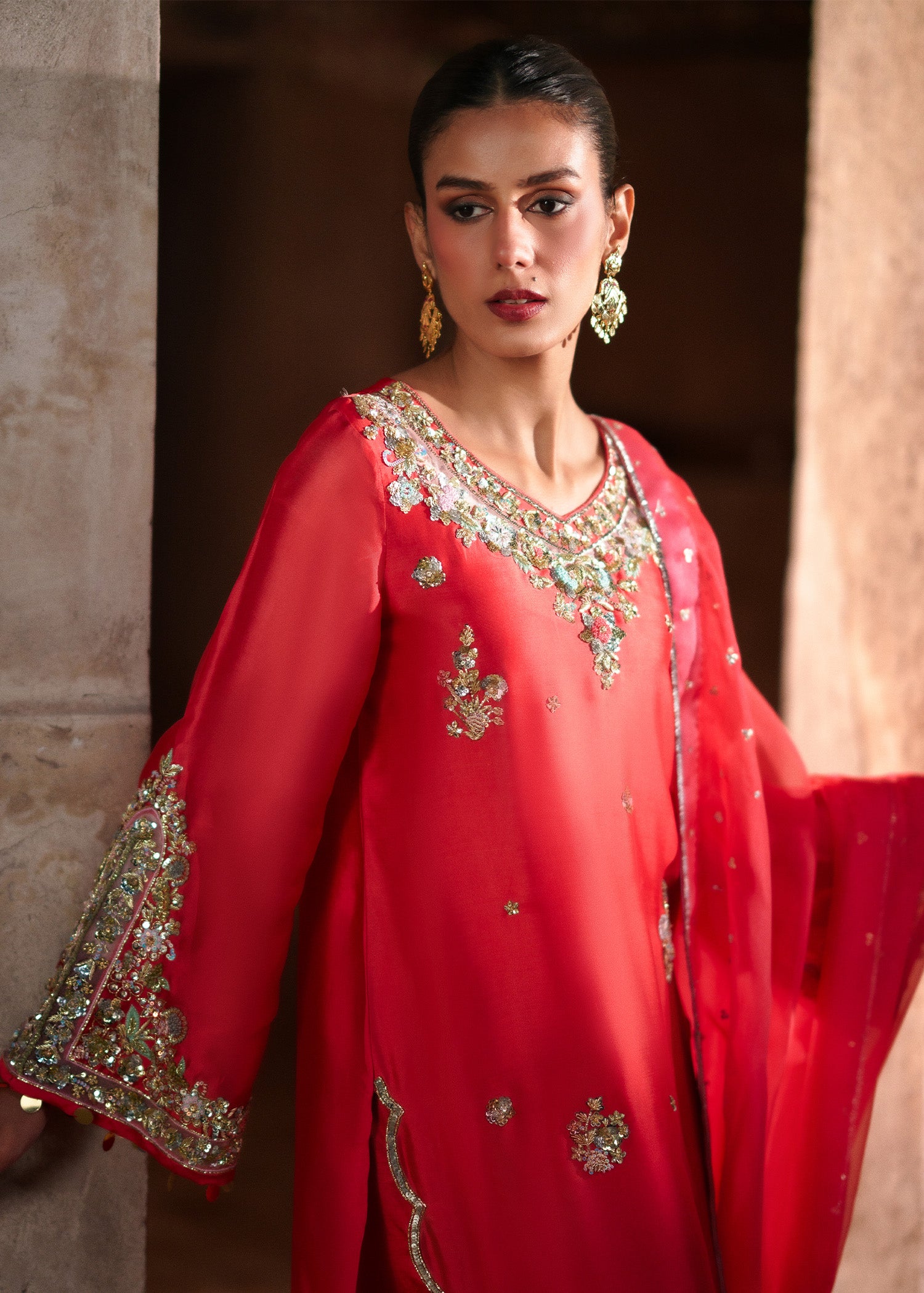 A coral red long shirt featuring a hand-embellished scalloped border on hemline, extend towards chaak with delicate motif spray throughout. Designed with a heavily embellished neckline and statement sleeves adorned with intricate handwork using baithki, naqshi, dhabka, sequins, mukesh. Paired with plain trousers and a sheer organza dupatta, finished with an embellished border and all-over detailing. A refined balance of craftsmanship and contemporary elegance.