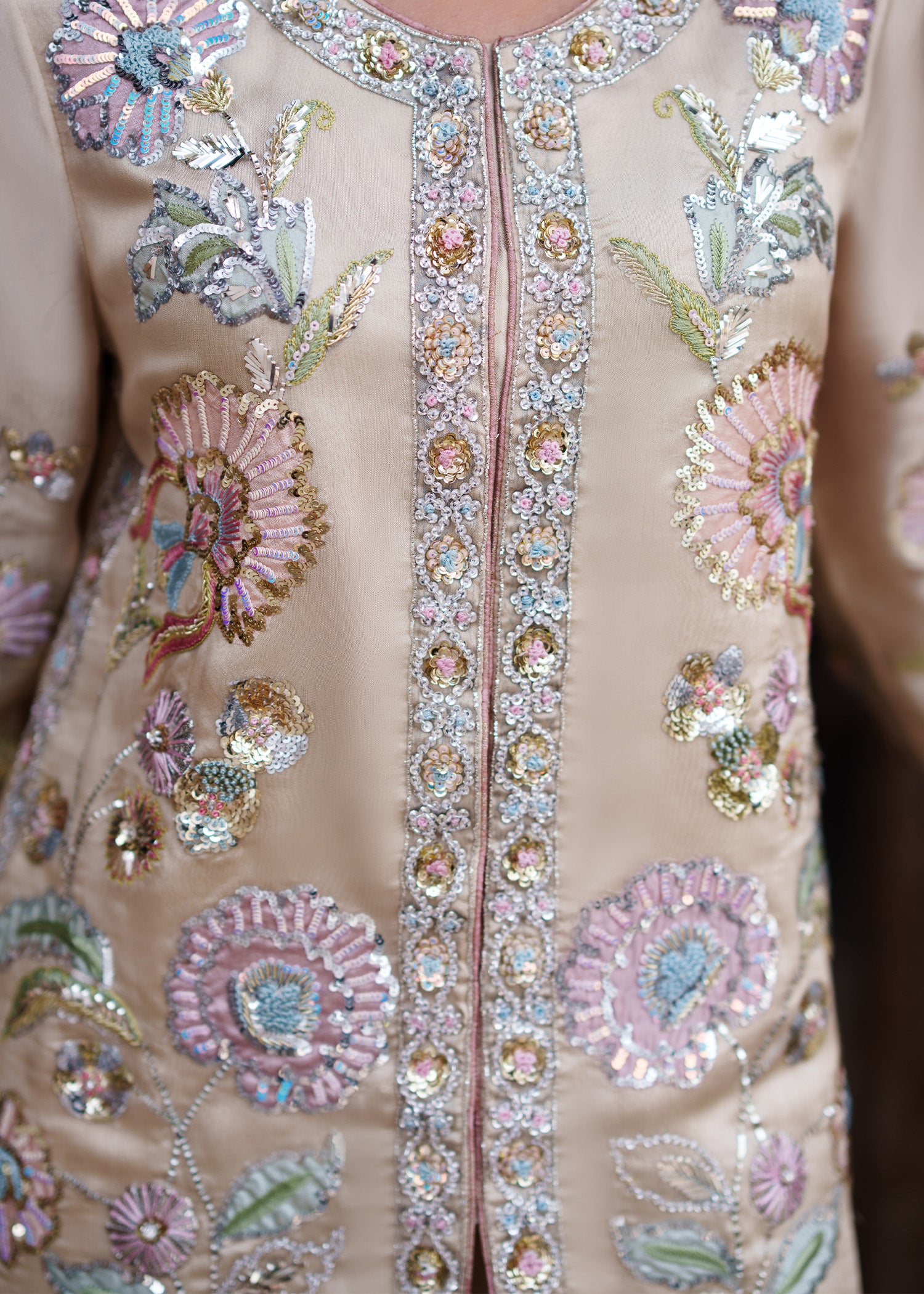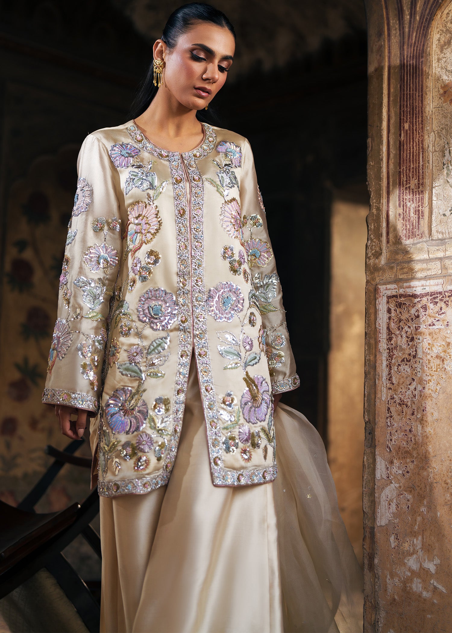 A short jacket adorned with pastel-toned jaal appliqués, intricately enhanced with fine zardozi work. Paired with relaxed, loose-fit trousers for effortless balance, the ensemble is completed with a sheer dupatta finished with an all-over sequin spray, adding a soft shimmer and refined elegance to the look